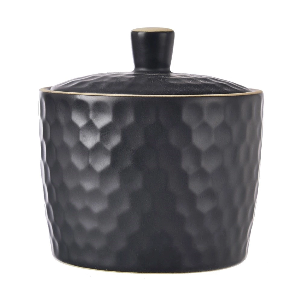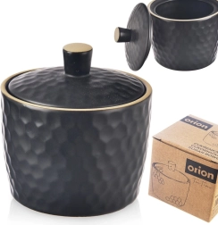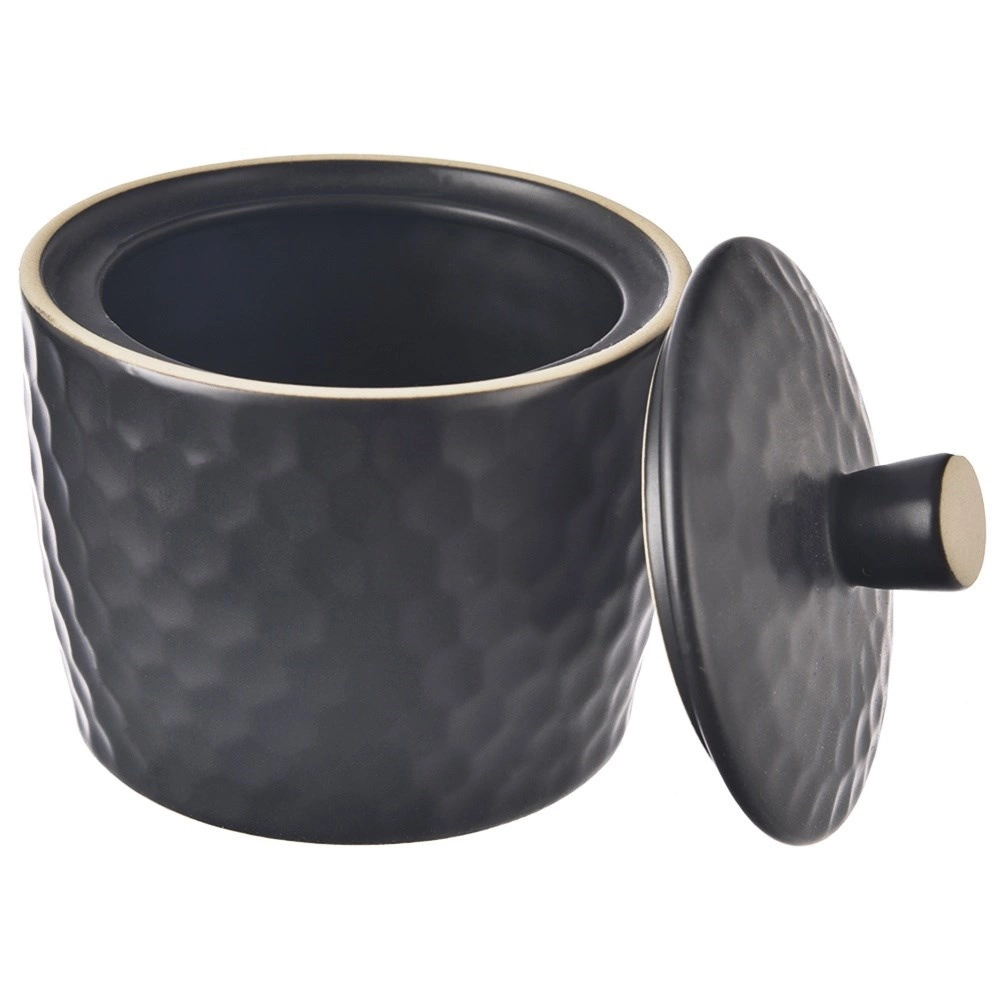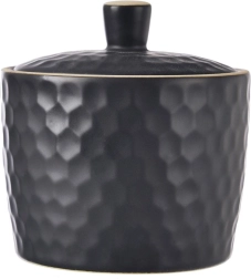 Stilfuld sort sukkerskål i stentøj med en kapacitet på 320 ml, låg med knop og en elegant relief, der minder om bikuber. Perfekt til servering af sukker, matcher enhver borddækning og er egnet til opvaskemaskine og mikrobølgeovn.