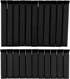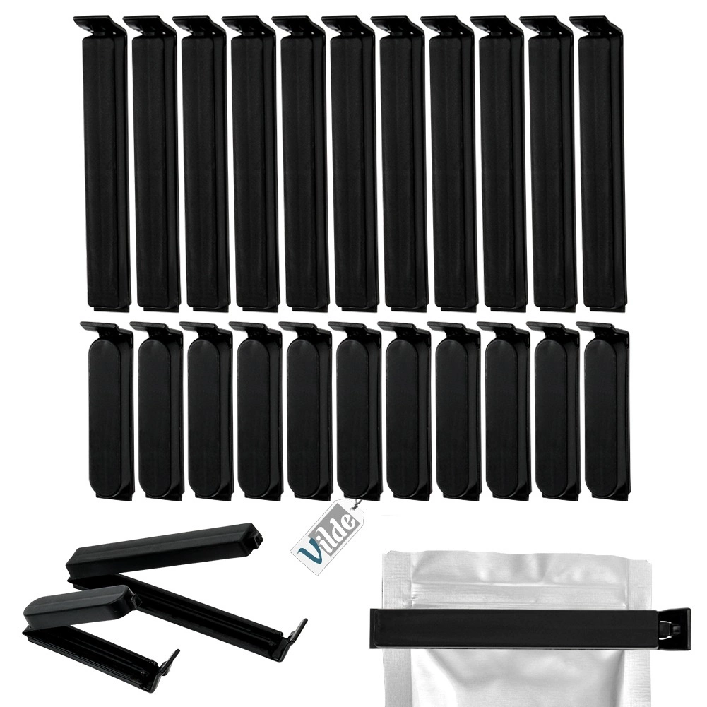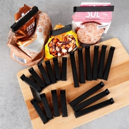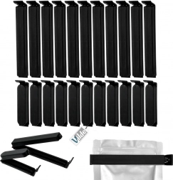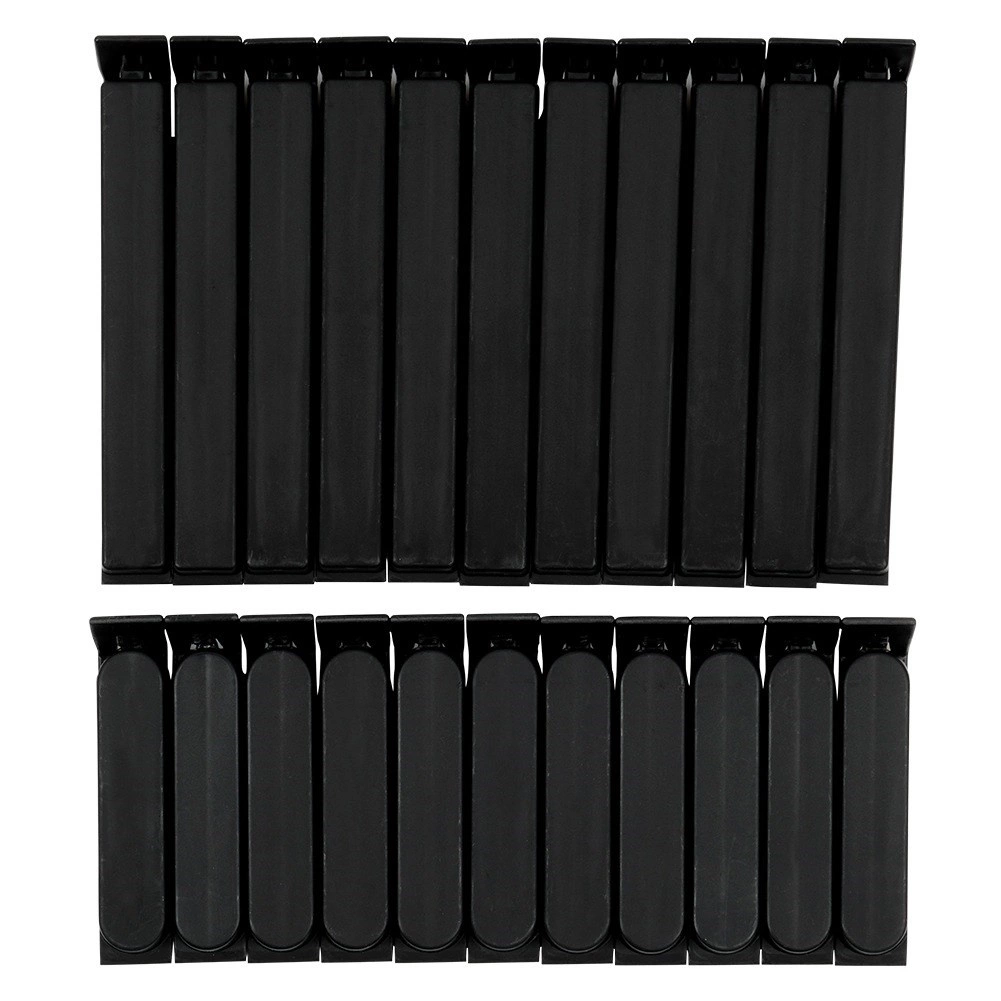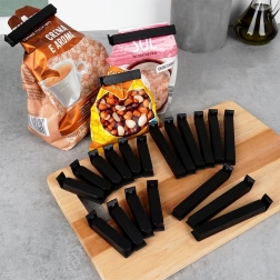 Pakken indeholder 11 længere og 11 kortere klemmer. De længere til bredere poser, de kortere til mindre emballager med krydderier eller snacks.
