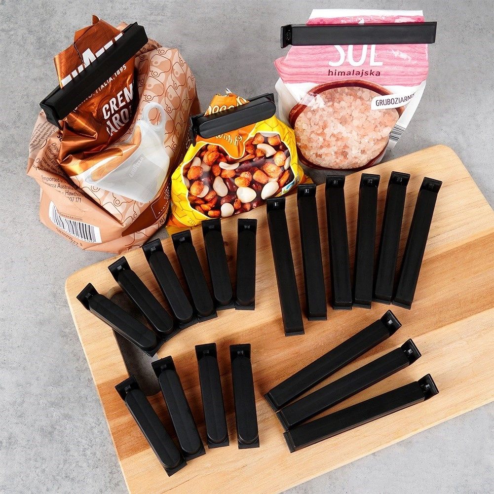 Sættet indeholder 22 holdbare plastklemmer i en praktisk kombination af størrelser til daglig brug i køkkenet. Takket være det faste greb holder de poser pålideligt lukkede og hjælper med at bevare duft, smag og sprødhed længere.