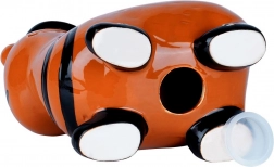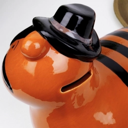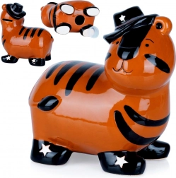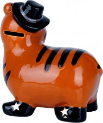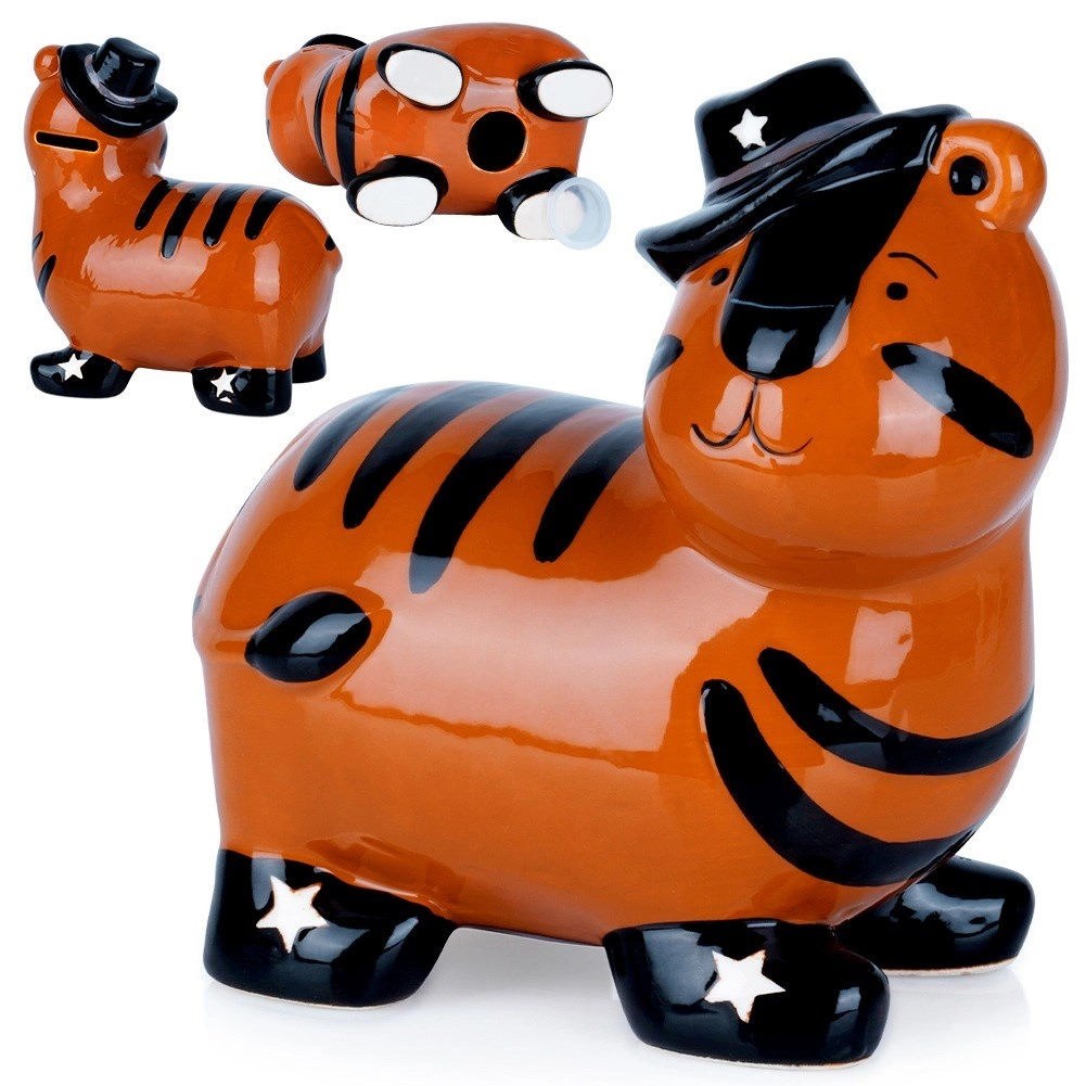 Denne keramiske sparebøsse i form af en tiger kombinerer funktionalitet og dekorativt udtryk. Den blanke orange overflade med sorte striber, hat og stjerner på skoene giver et legende udtryk, der liver op i både børneværelset og et moderne interiør. Takket være bundåbningen med aftagelig prop kan du gentagne gange tage opsparingen ud uden at slå den i stykker.