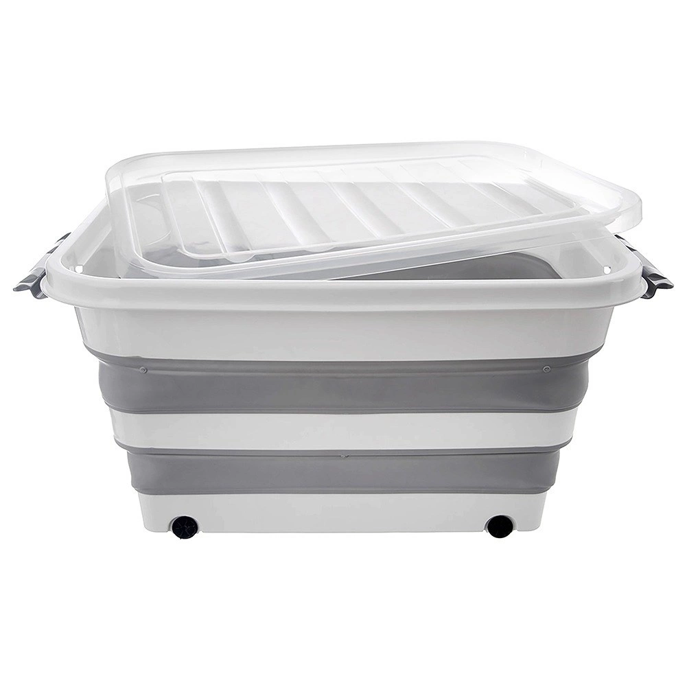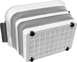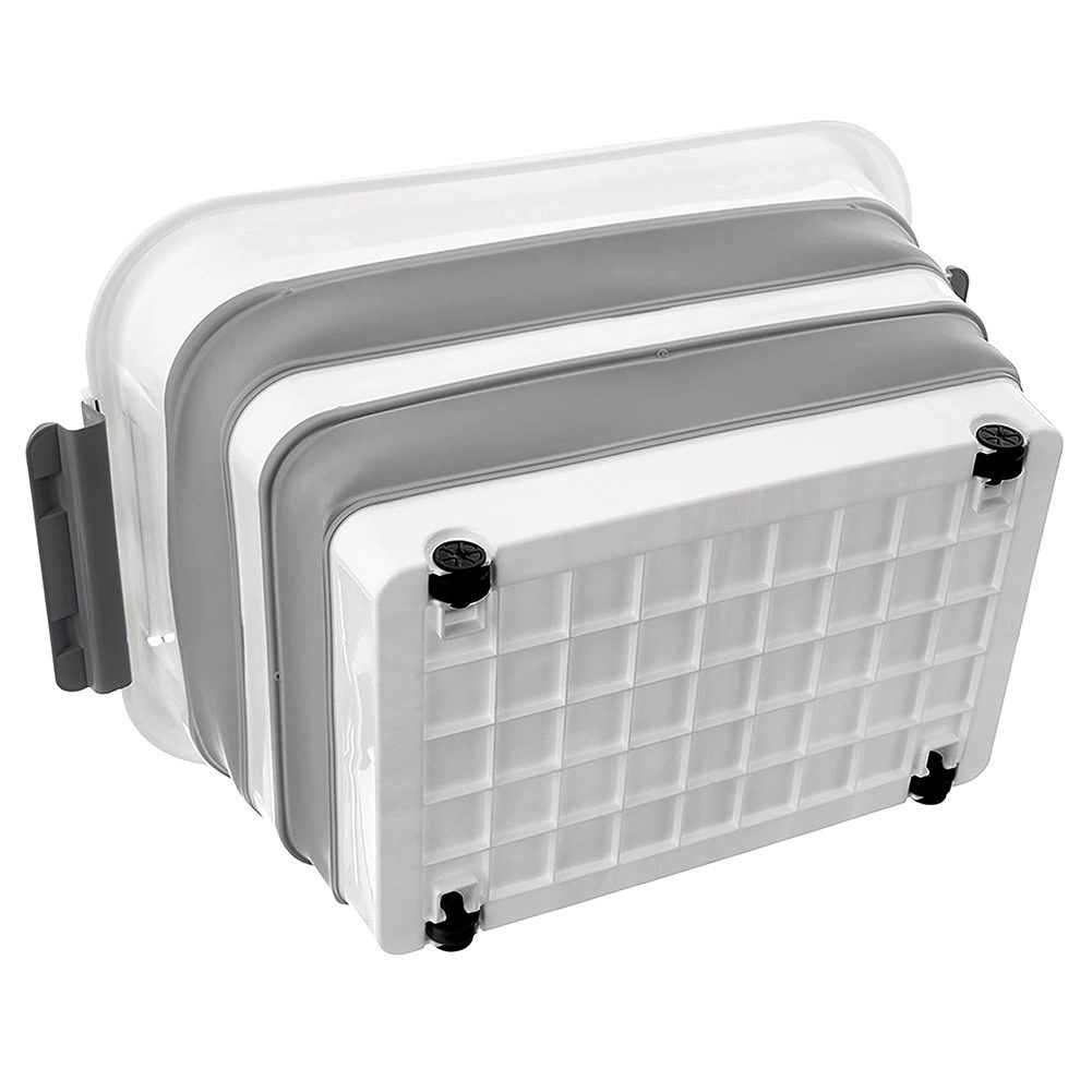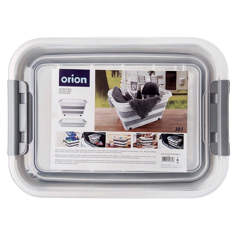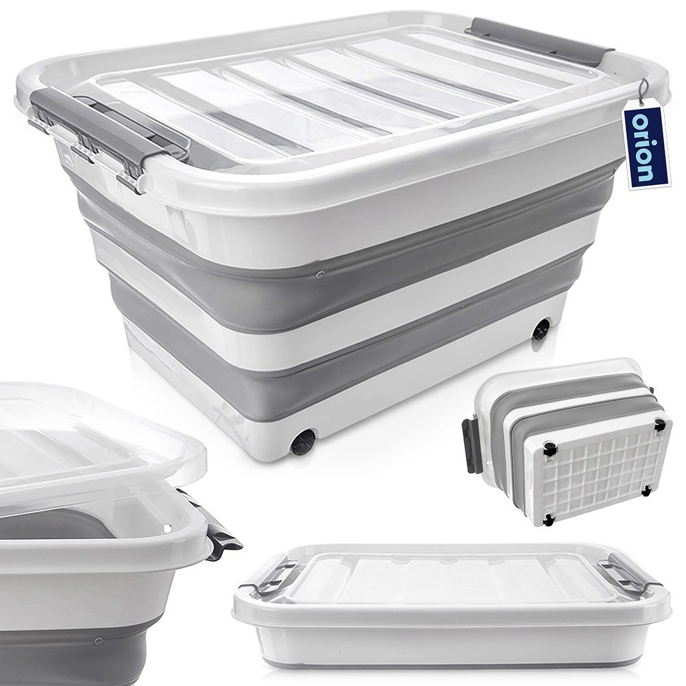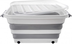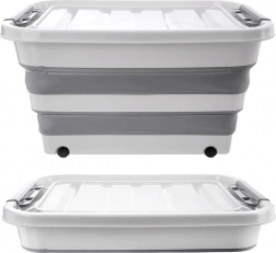Praktisk sammenklappelig opbevaringsboks med volumen på 30 l, med hjul og gennemsigtigt låg til nem organisering af hjemmet. Takket være den sammenklappelige konstruktion sparer den plads, har stærke låse på låget og er fremstillet af holdbare materialer. Velegnet til tekstiler, legetøj, tøj og bøger. Mobil takket være hjulene, sammenklappeligt design, sikker lukning og alsidig anvendelse.