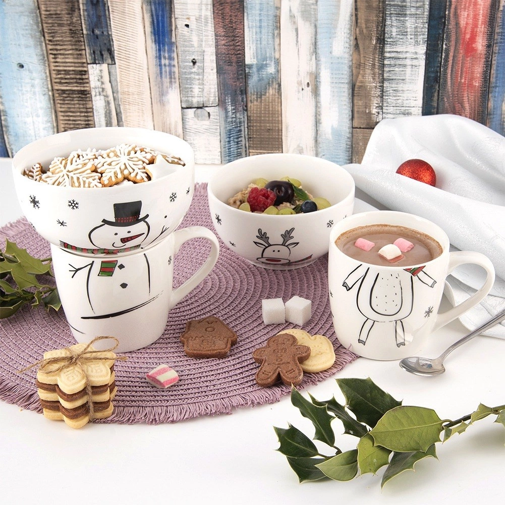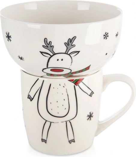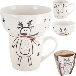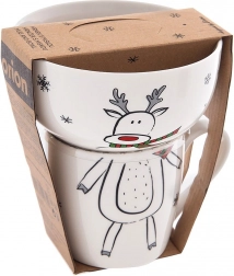 Opdag et praktisk og stilfuldt sæt til små spiseglade: et porcelænkrus (350 ml) og en skål (530 ml) med et muntert rensdyrmotiv, der begejstrer børn og gør hverdagens måltider sjovere. Sættet er som skabt til morgenmad, supper, mellemmåltider og desserter og passer til børn fra 3 år.