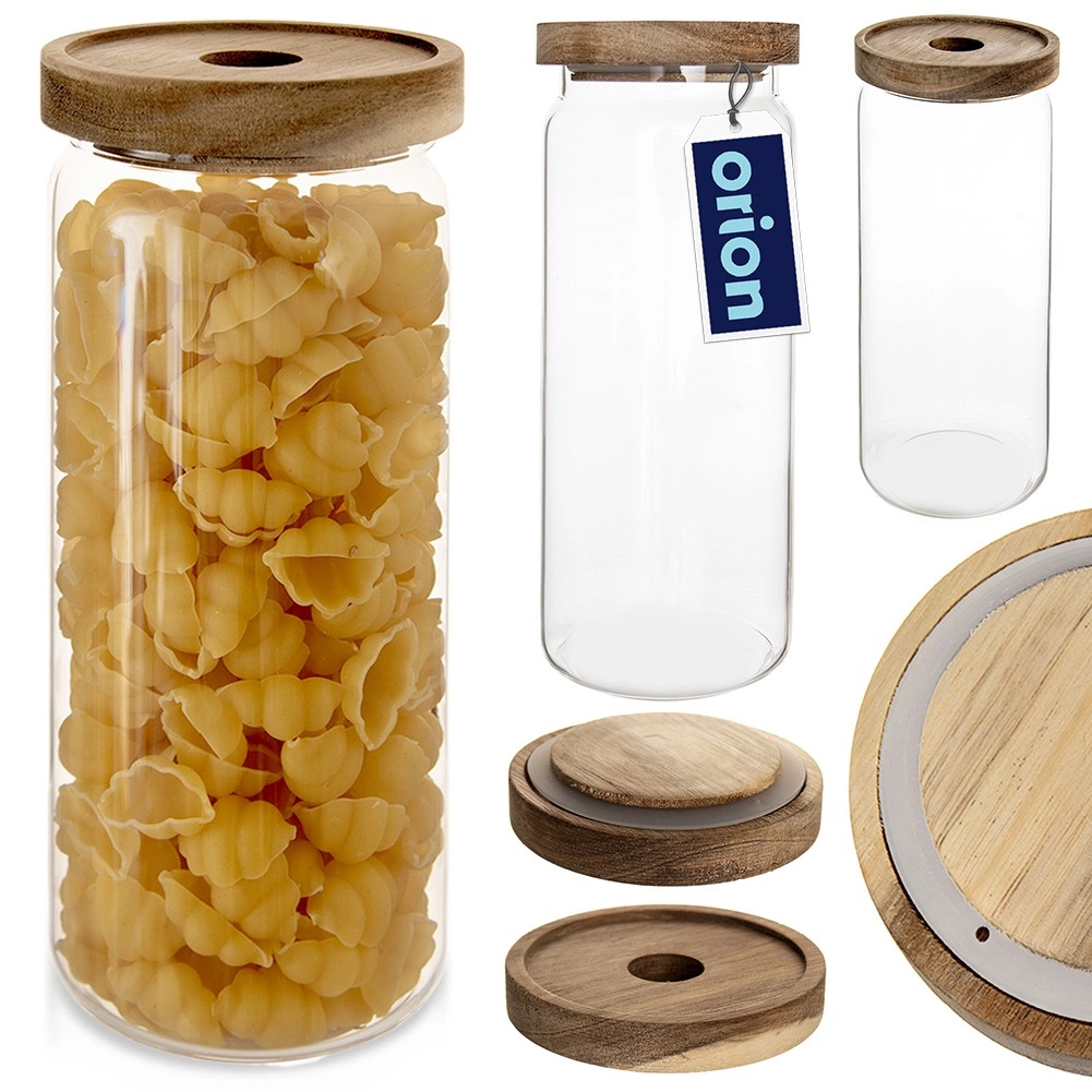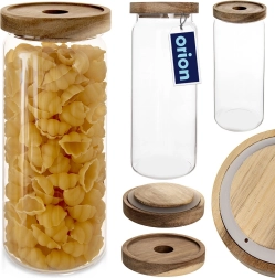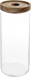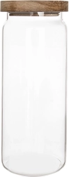 Praktisk glaskrukke med en kapacitet på 1,6 l med trælåg og siliconepakning, som holder dine fødevarer friske og velduftende i længere tid. Det robuste borosilikatglas er ideelt til daglig brug, de gennemsigtige sider giver øjeblikkelig overblik over indholdet, og det elegante udseende forskønner ethvert køkken. Krukken er velegnet til kaffe, pasta, nødder, müsli og andre tørre ingredienser, og glaskroppen kan vaskes i opvaskemaskine.
