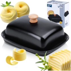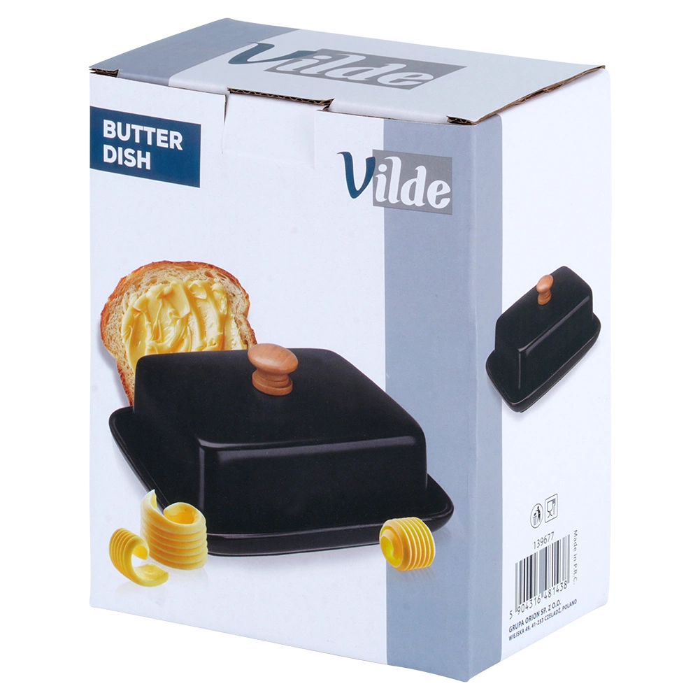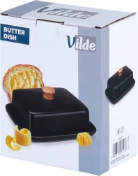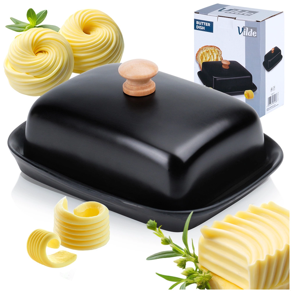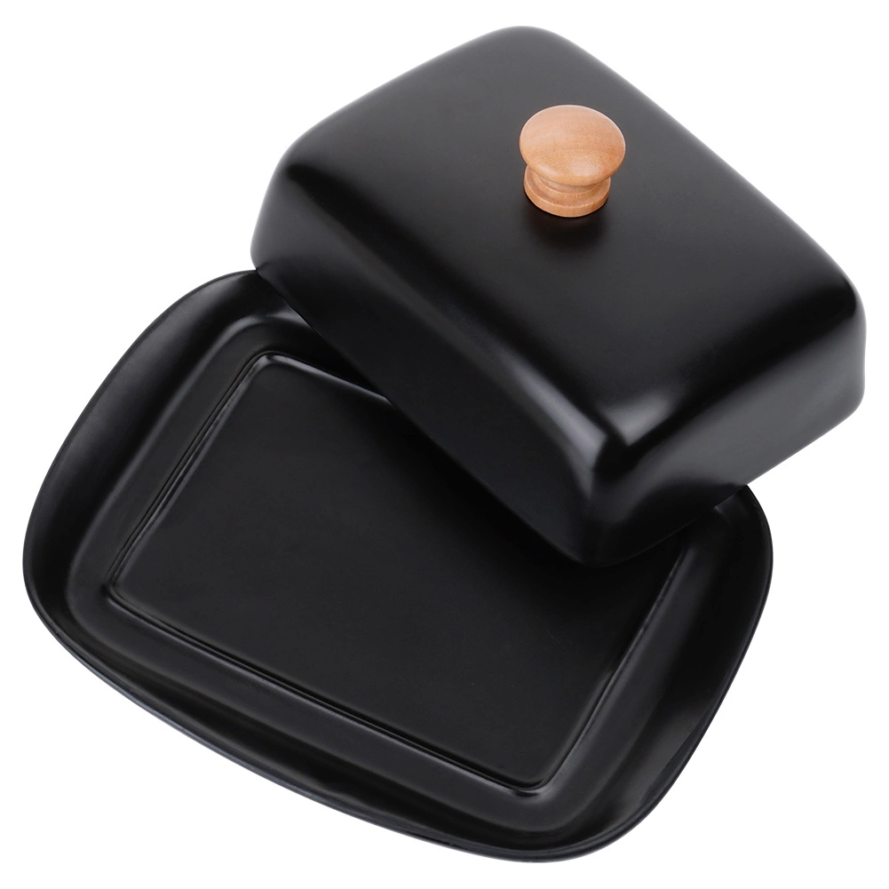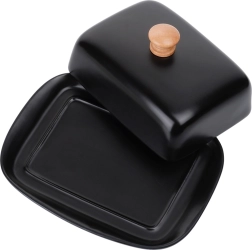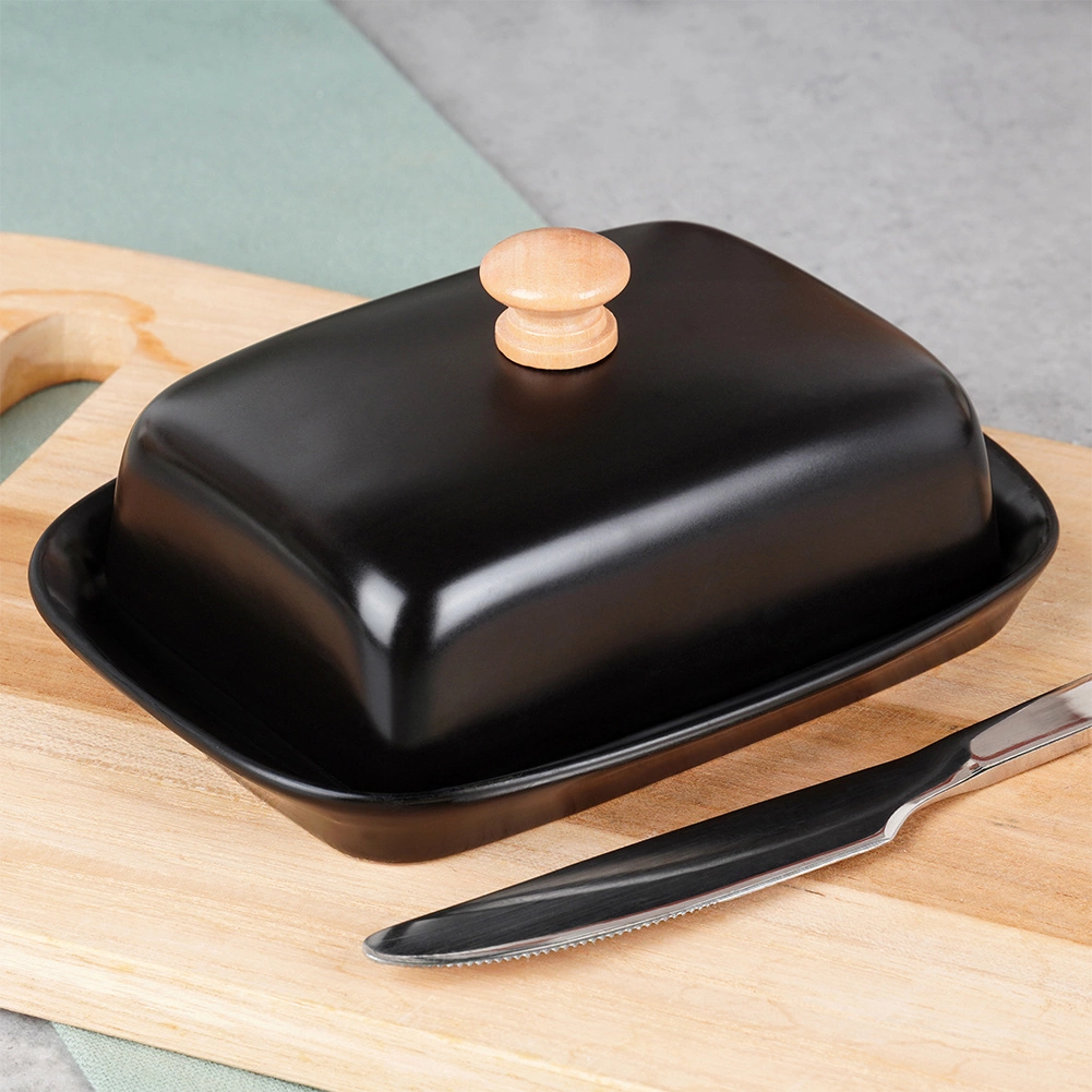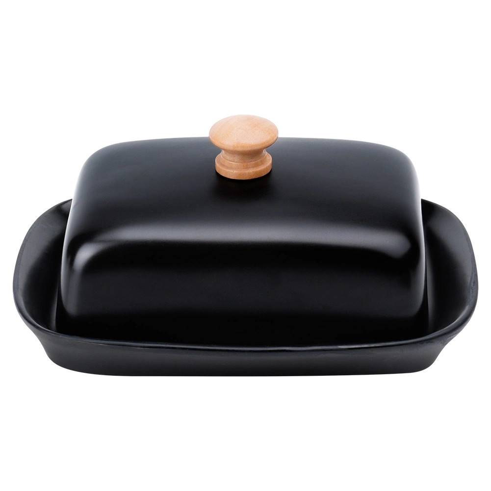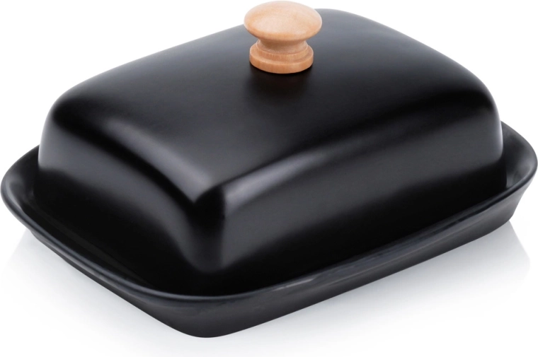 Denne stilfulde smørboks i kvalitetskeramik i sort er ideel til daglig brug derhjemme og til servering ved bordet. Trægrebet på låget gør det nemt at løfte, mens det tætsluttende låg beskytter smørret mod udtørring og uønskede lugte.