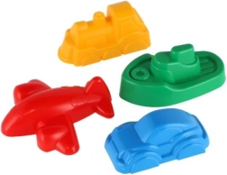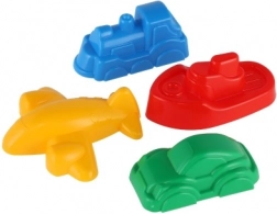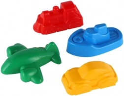 Tog, båd, fly og bil i klare farver motiverer børn til at skabe og lege i sandet og ved vandet.