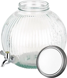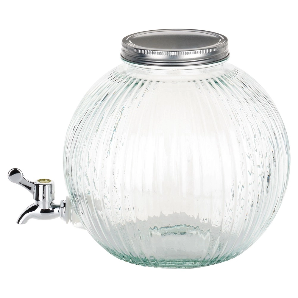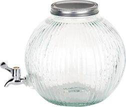 Stilfuld rund drikkedispenser i kraftigt glas med en kapacitet på 5,5 l gør det nemt at servere kolde drikke til familie og gæster. Takket være den integrerede hane hælder du bekvemt uden at spilde, mens det skruede metaldåg beskytter indholdet mod insekter og snavs.
