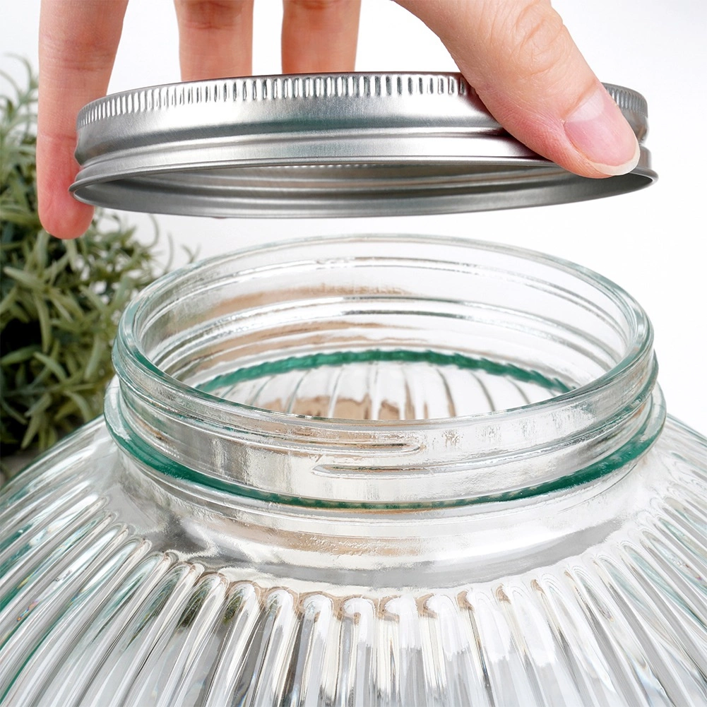 Elegant glasdrikkedispenser på 5,5 l med metallåg og praktisk hane er ideel til servering af lemonade, vand med frugt, punch eller iste. Robust riflet glas, bred åbning for nem påfyldning og rengøring samt skruelåg mod insekter gør denne dispenser til et perfekt valg til havefester og hjemmefejringer.