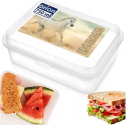 Denne lette og holdbare madkasse i plast af høj kvalitet er et glimrende valg til skole, udflugter og rejser. Det gennemsigtige design med et iøjnefaldende hestemotiv gør det nemt for børn at genkende deres boks. Det ene rummelige rum rummer sandwich, frugt, grøntsager og små snacks.