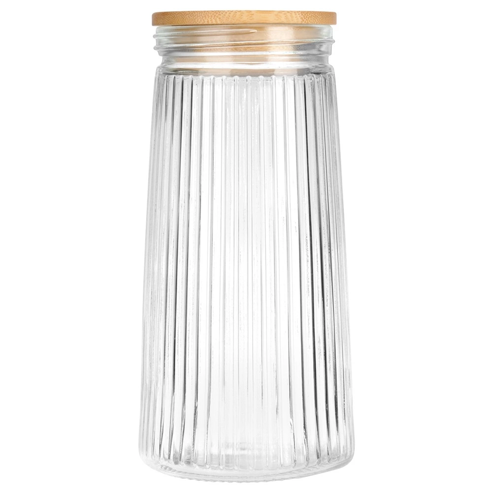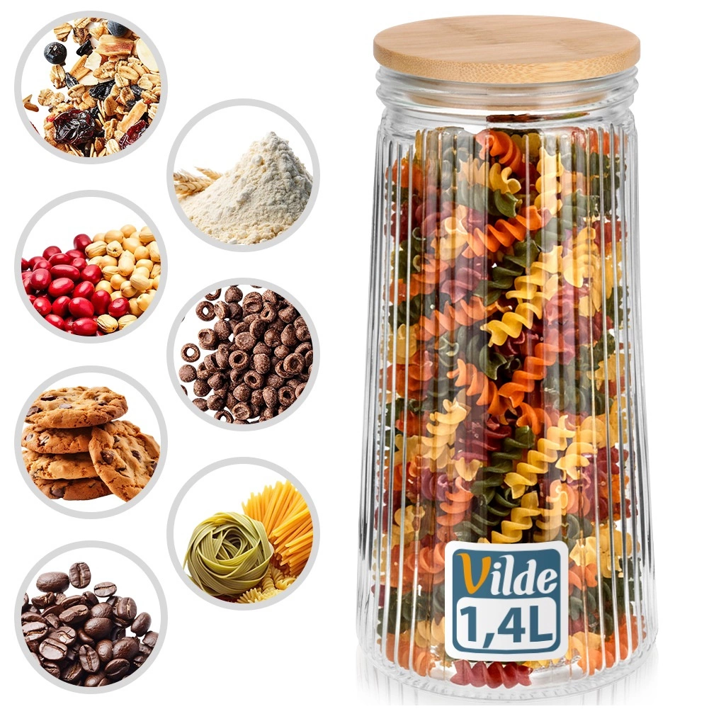 Elegant glaskrukke på 1,4 l med silikontætning og bambuslåg holder dine fødevarer friske længere. Fremstillet af holdbart borosilikatglas med dekorative riller for bedre greb og et stilfuldt look i ethvert køkken. Ideel til kaffe, pasta, mysli eller nødder. Krukken er lufttæt, temperaturbestandig og egnet til opvaskemaskine (uden låg).