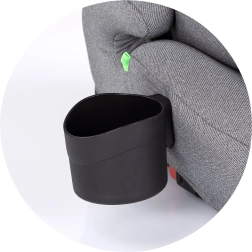 Justerbar hovedstøtte, blød polstring og kopholder. Aftageligt, vaskbart betræk holder stolen hygiejnisk ren.