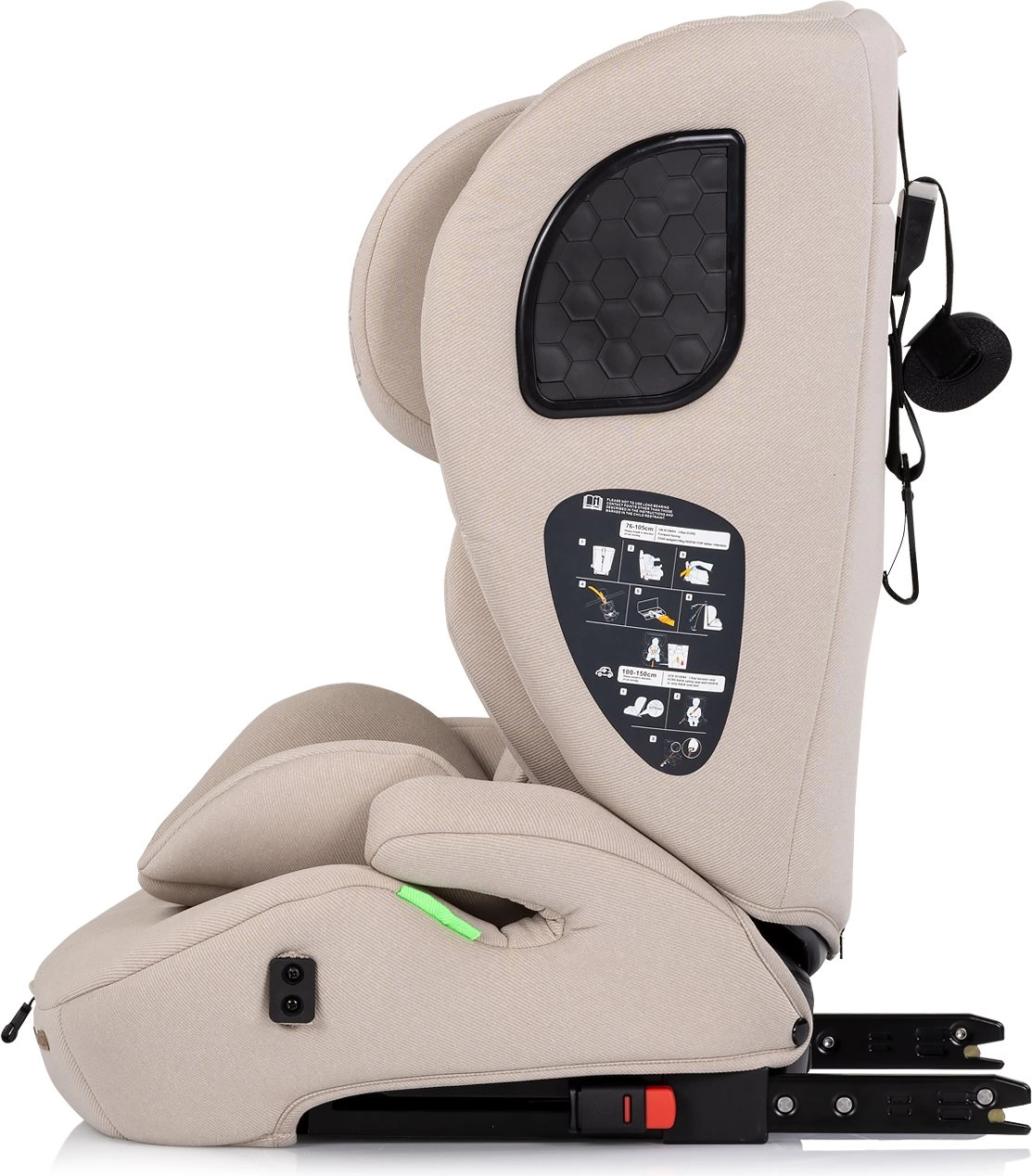 - Hurtig installation – ISOFIX + Top Tether (76–105 cm), bilens 3-punkts sele med/uden ISOFIX (100–150 cm).