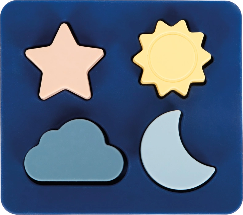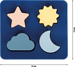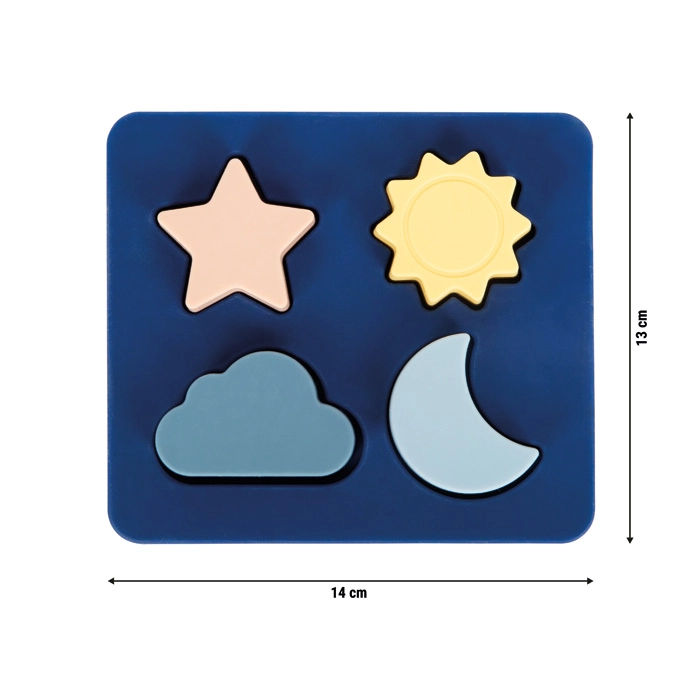 Sødt børnepuslespil af 100 % fødevaregodkendt silikone uden BPA, som giver sikker og sjov læring for de mindste. Indeholder 4 brikker formet som sol, måne, stjerne og sky, der kan sættes i fra forskellige sider. Legetøjet er blødt, ubrugbart, ikke-giftigt, nemt at rengøre og ideelt til leg hjemme, i vand og i sand – perfekt til rejser og til udvikling af finmotorik og sansemæssig perception.