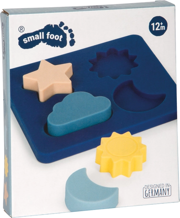 Silikonepuslespillet small foot er designet til små hænder og nysgerrige hoveder. Fire pastelformer – sol, måne, stjerne og sky – er lette for børn at gribe og sætte i pladen fra forskellige sider, hvilket styrker kreativitet og naturlig læring af former og farver. Materialet af fødevaregodkendt silikone uden BPA er blødt at røre ved, lugtfrit og helt sikkert selv ved kontakt med munden.