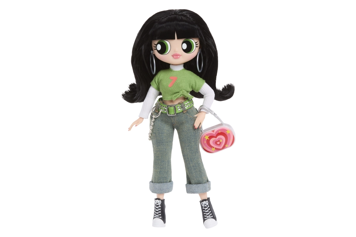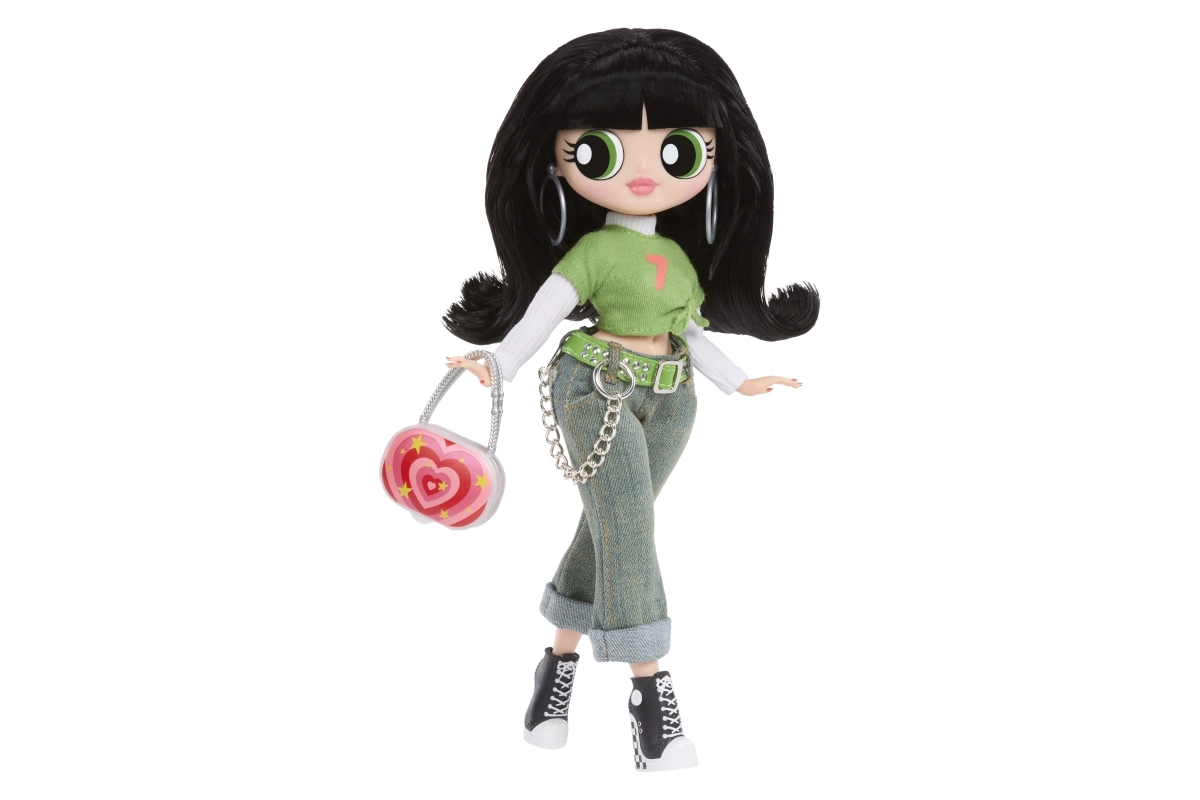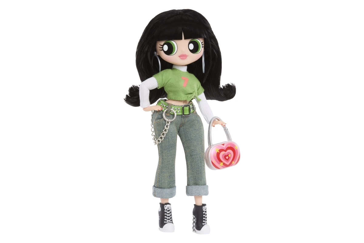 Grøn crop top, jeans med kæde og sorte sneakers kompletteres af en markant taske og øreringe – Buttercups ikoniske look i L.O.L.-fortolkning.