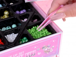 Smykkeæsken har tre overskuelige niveauer: øverst et stort spejl og rum til ringe, øreringe og tilbehør til armbånd og kæde, i midten farvede perler i forskellige former og størrelser til nem perlesyning, og nederst hårpynt – elastikker, spænder og sløjfer til at fuldende stylingen. Takket være den elastiske nylontråd og pincetten er det nemt at træ perler på – selv for begyndere.