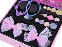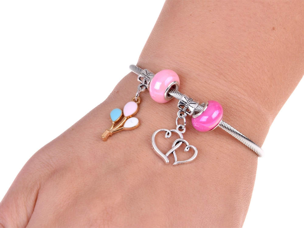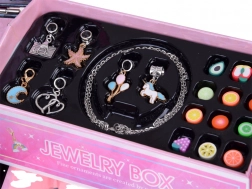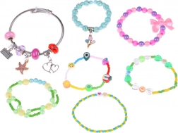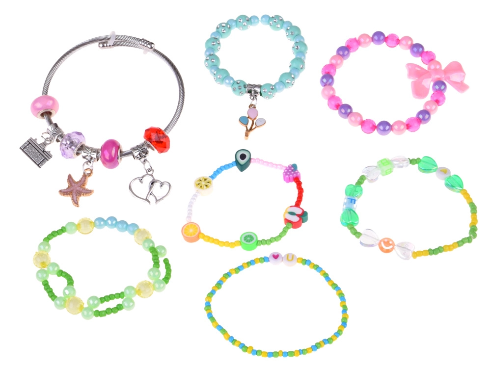 - Komplet tilbehør: perler, vedhæng, metalarmbånd, kæde, clip-on øreringe, 2 ringe, elastisk snor, pincet, elastikker, spænder, sløjfer