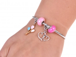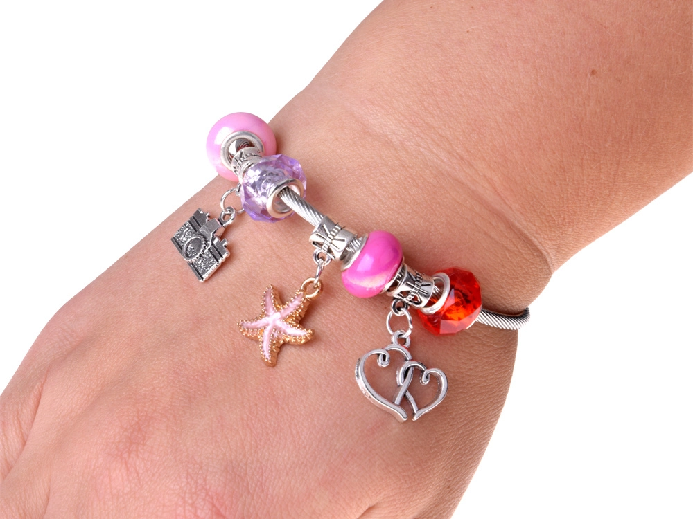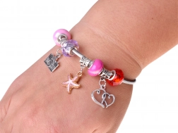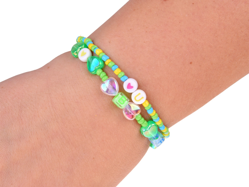 Farverige perler, charms og vedhæng gør det muligt at designe unikke armbånd og halskæder. Elastisk snor og pincet gør det lettere at trække perler på – også for mindre børn.