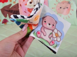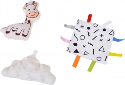 - Bidering, plysgiraf, blød sky, sikkert spejl, knitrepude med mærkebånd, kontrastfyldte stofbøger