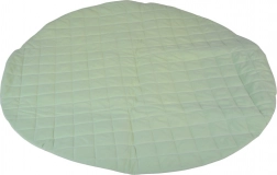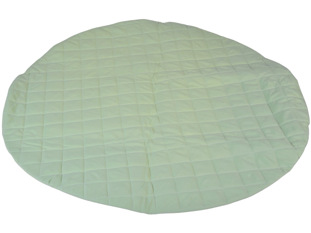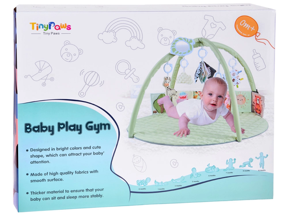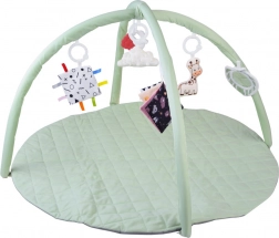 Dette runde, let polstrede legetæppe i pastelmint skaber et sikkert og behageligt sted til daglige opdagelser. To fleksible buer med enkel aftagning gør vedligeholdelsen hurtig og muliggør kompakt pakning til turen. Varierende teksturer, knitreelementer og kontrastmønstre stimulerer naturligt syn, hørelse og berøring, mens de hængende legetøj motiverer til at række ud, sparke og rulle.