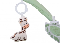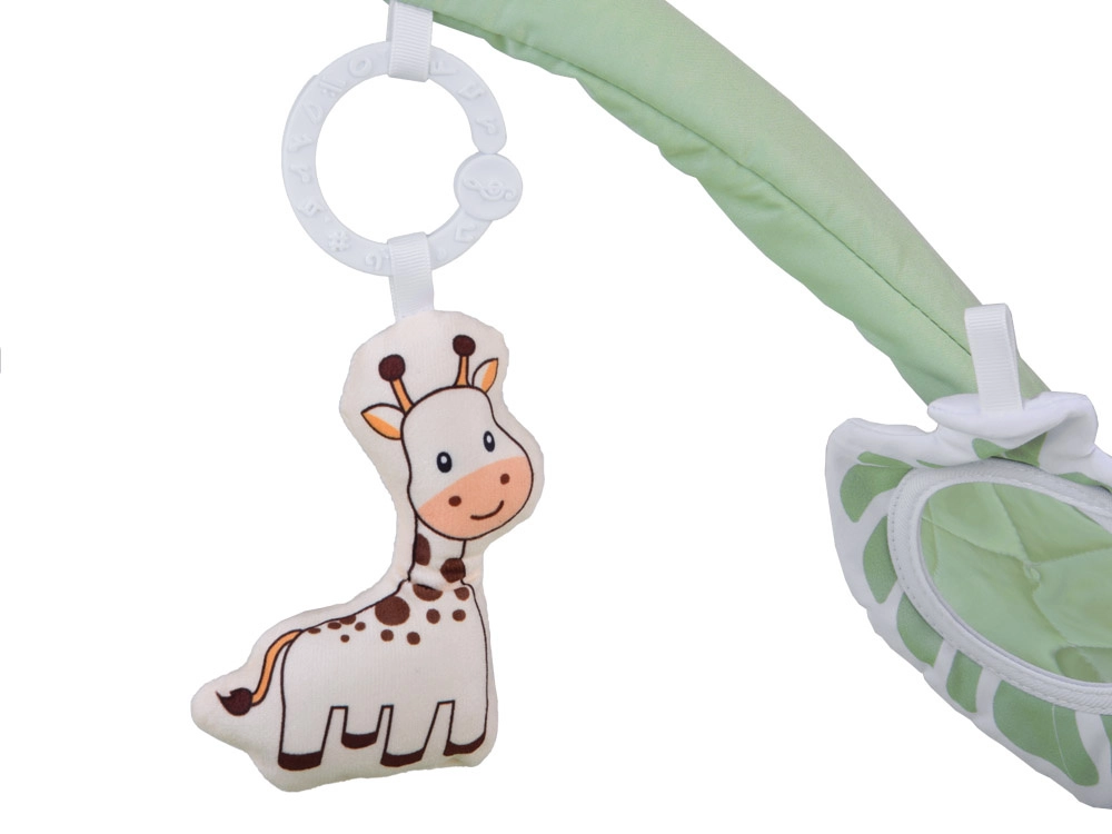 De to fleksible buer kan nemt tages af for vask eller rejse. De ophængte legetøj – bidering, sky, giraf og knitrepuder – motiverer til at række ud og udvikler sanserne.
