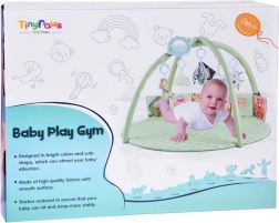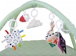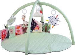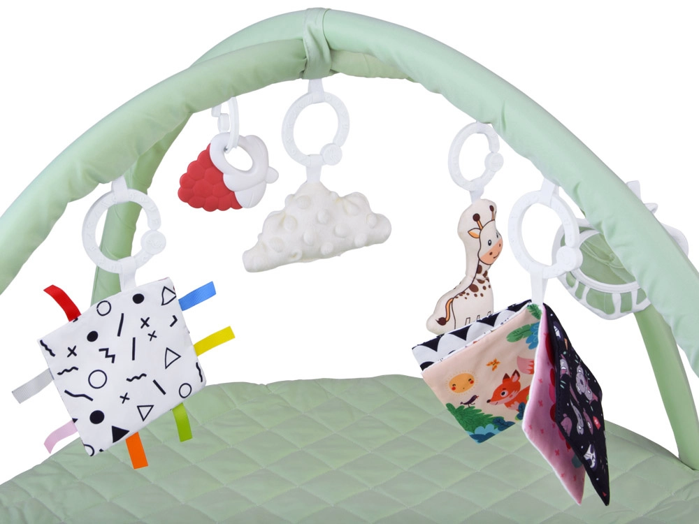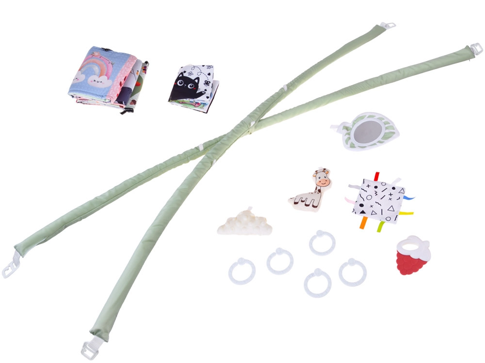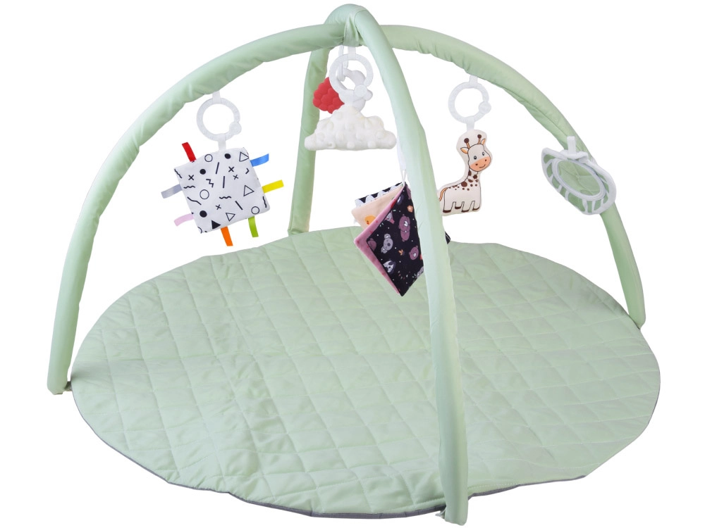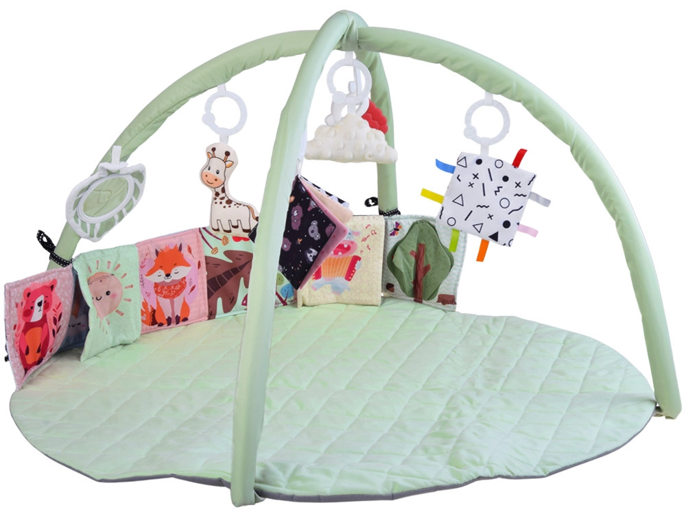 Blødt, rundt pædagogisk legetæppe med to aftagelige buer og et rigt sæt legetøj, der støtter barnets udvikling fra de allerførste dage. Det tilbyder behagelig polstring til maveleg, hængende legetøj til at gribe og følge med øjnene, en kontrastbog, et sikkert spejl, rangle og bidering for sansestimulering og finmotorik.