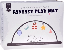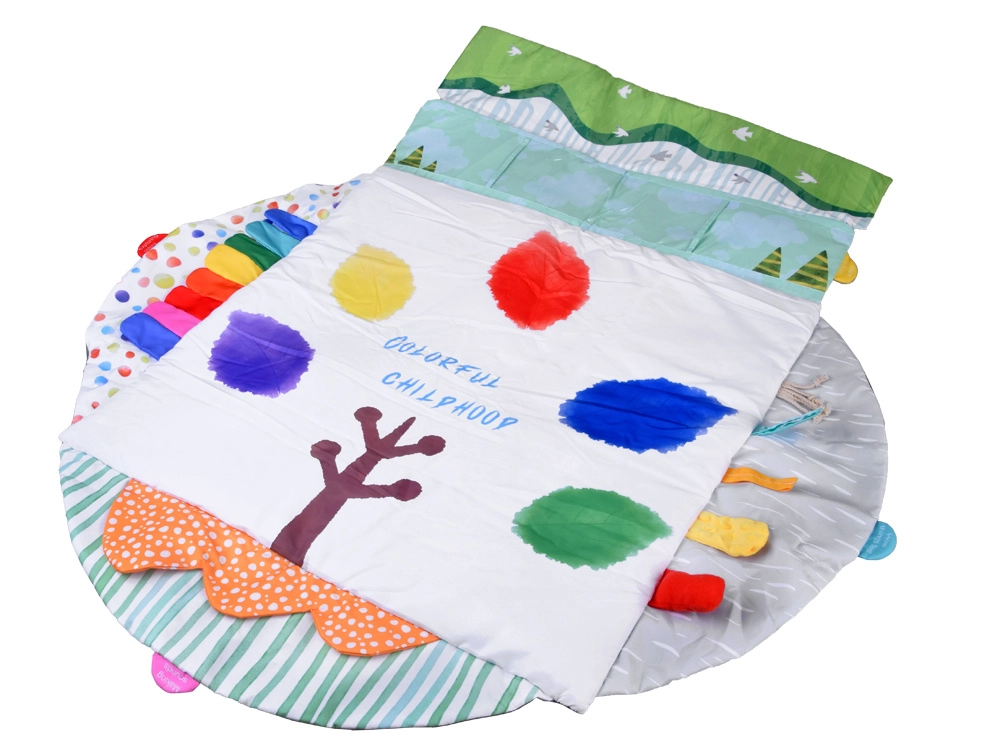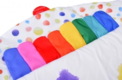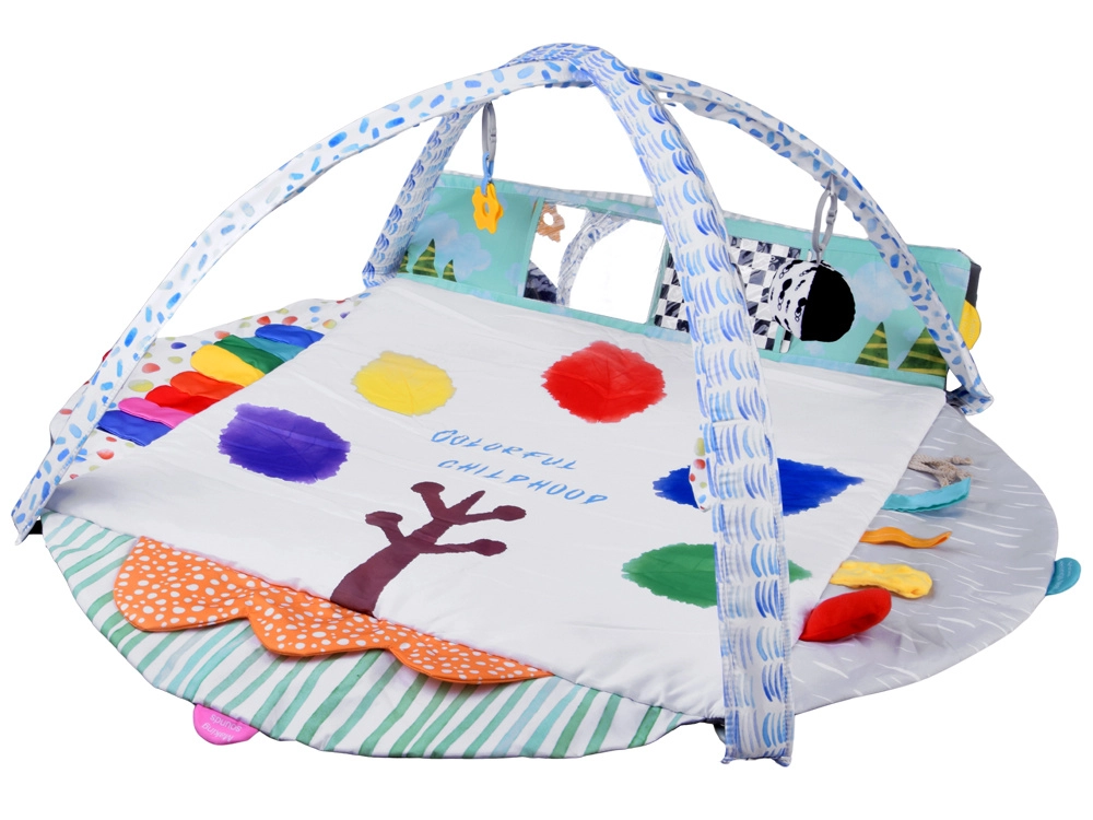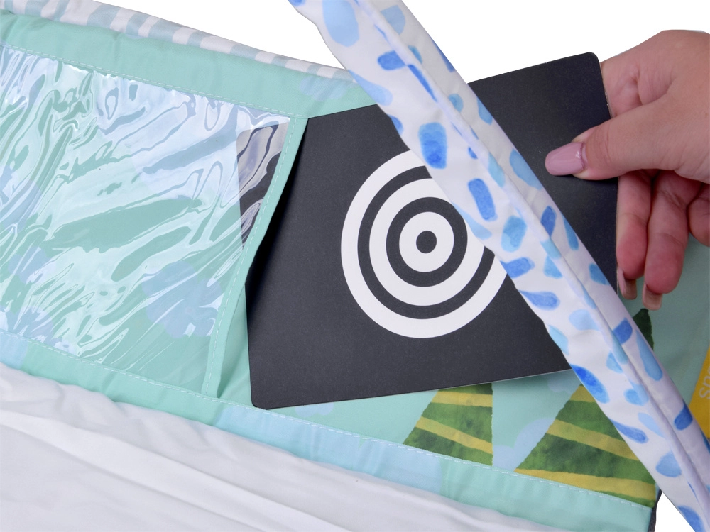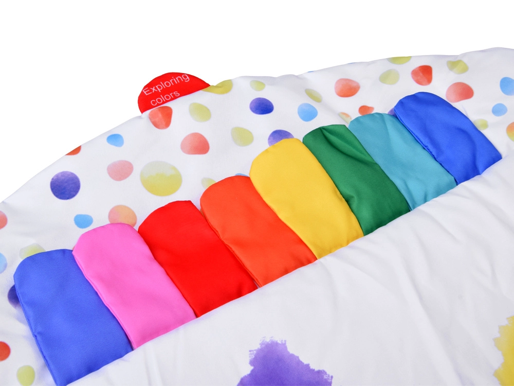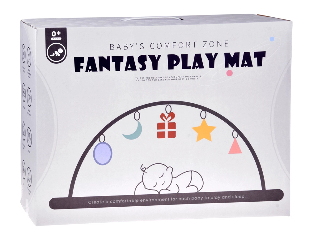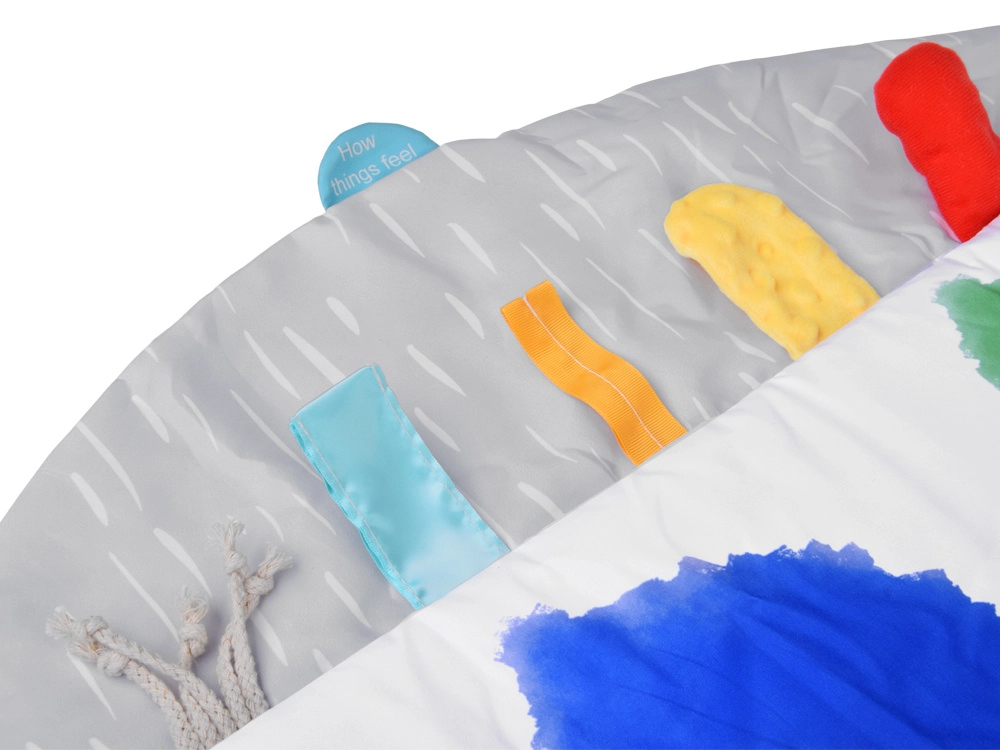 Inkluderer et farverigt sæt tilbehør: spejl til selvopdagelse, kontrastkort til visuel udvikling, plys-ophæng, bideringe, rasle samt knitrende detaljer. Måtten foldes hurtigt, er let at bære og enkel at holde ren – ideel både hjemme og på rejser.