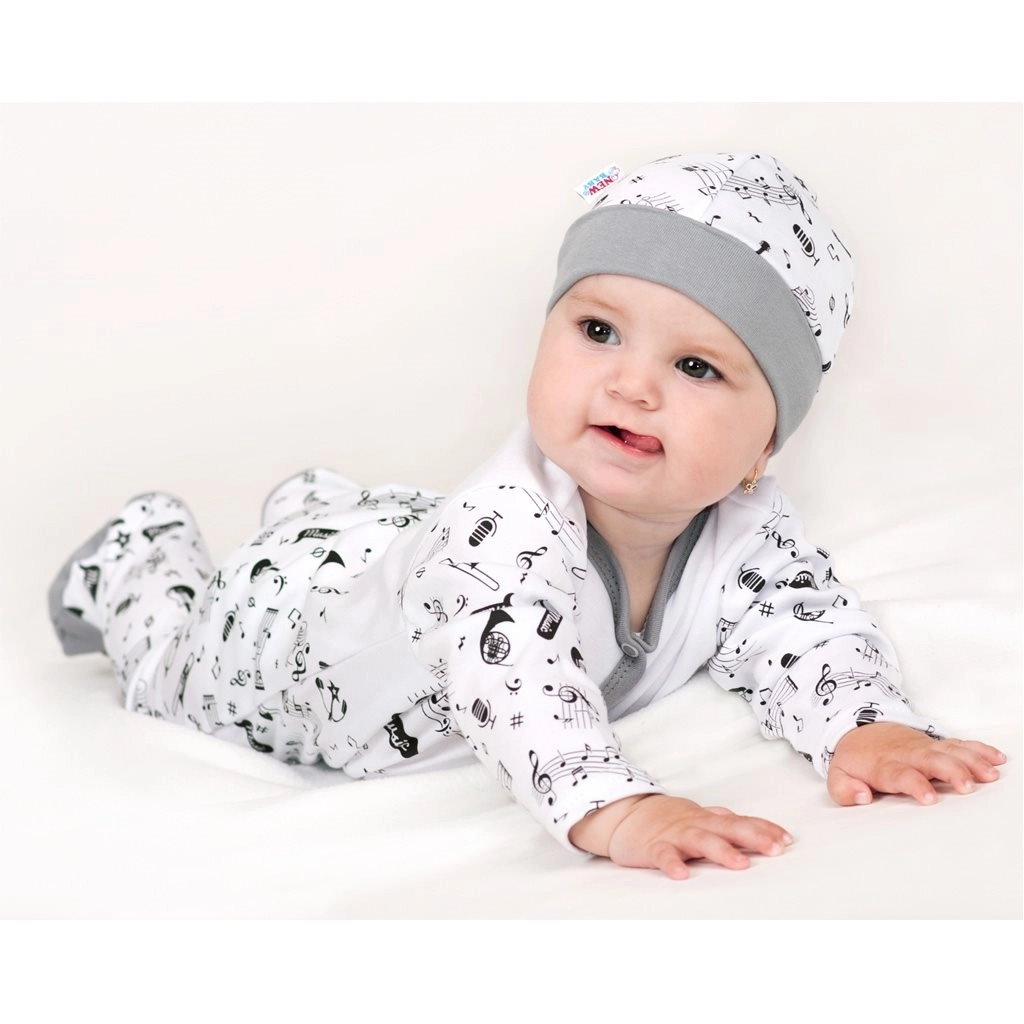 Det stilfulde print med noder og musikalske motiver giver huen et unikt look, som passer til piger og drenge. Takket være det universelle design kan den nemt kombineres med andre dele af babytøjet.