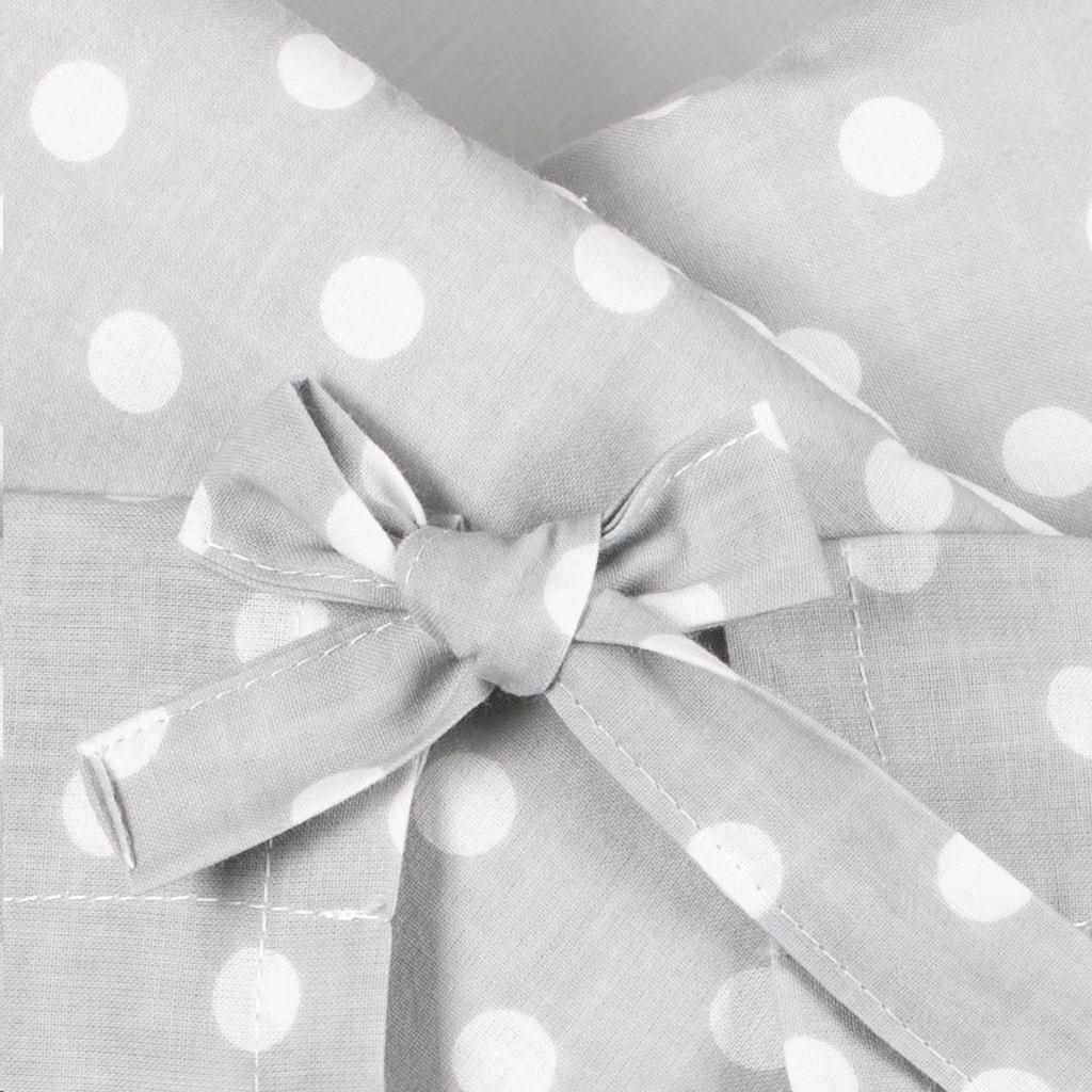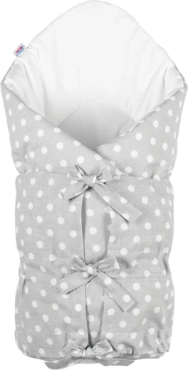 New Baby-svøbet i klassisk snøreudførelse vender tilbage som et gennemprøvet valg til barnets første måneder. Takket være tre rækker bånd omslutter det barnet fast og behageligt, hvilket giver en følelse af tryghed og hjælper med en rolig søvn. Det bløde bomuldsbetræk er skånsomt mod sensitiv hud, og det grå design med prikker passer nemt til resten af udstyret.