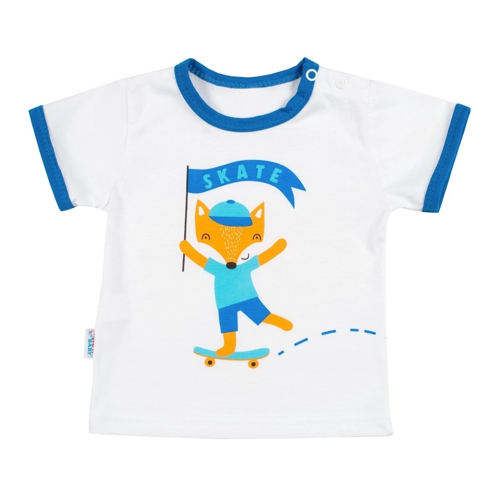 Dette babysæt NEW BABY med rævemotiv vil glæde enhver lille krudtugle. T-shirten med korte ærmer har kontrastkant ved hals og ærmer og er pyntet med et glad print af en ræv på skateboard med teksten SKATE. Praktisk lukning på skulderen gør det nemt at klæde på og af.