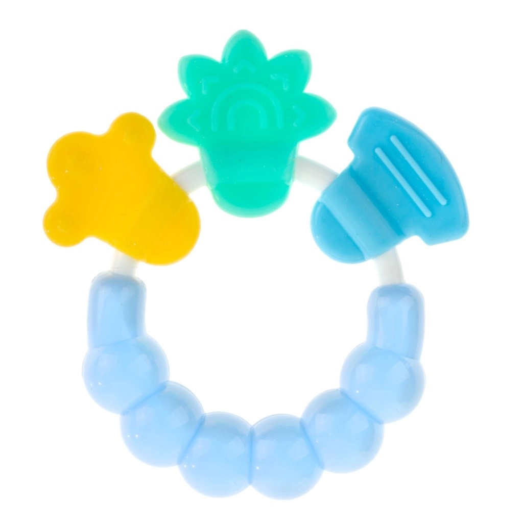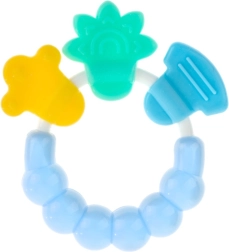Praktisk babyrangle med bidering fra mærket Akuku i blå udgave. Kombinerer sjov raslen og lindring ved tænders frembrud. Ideel til små hænder, sikker og let at rengøre. Velegnet til børn fra 3 måneder, kompakt størrelse ca. 9,5 cm.
