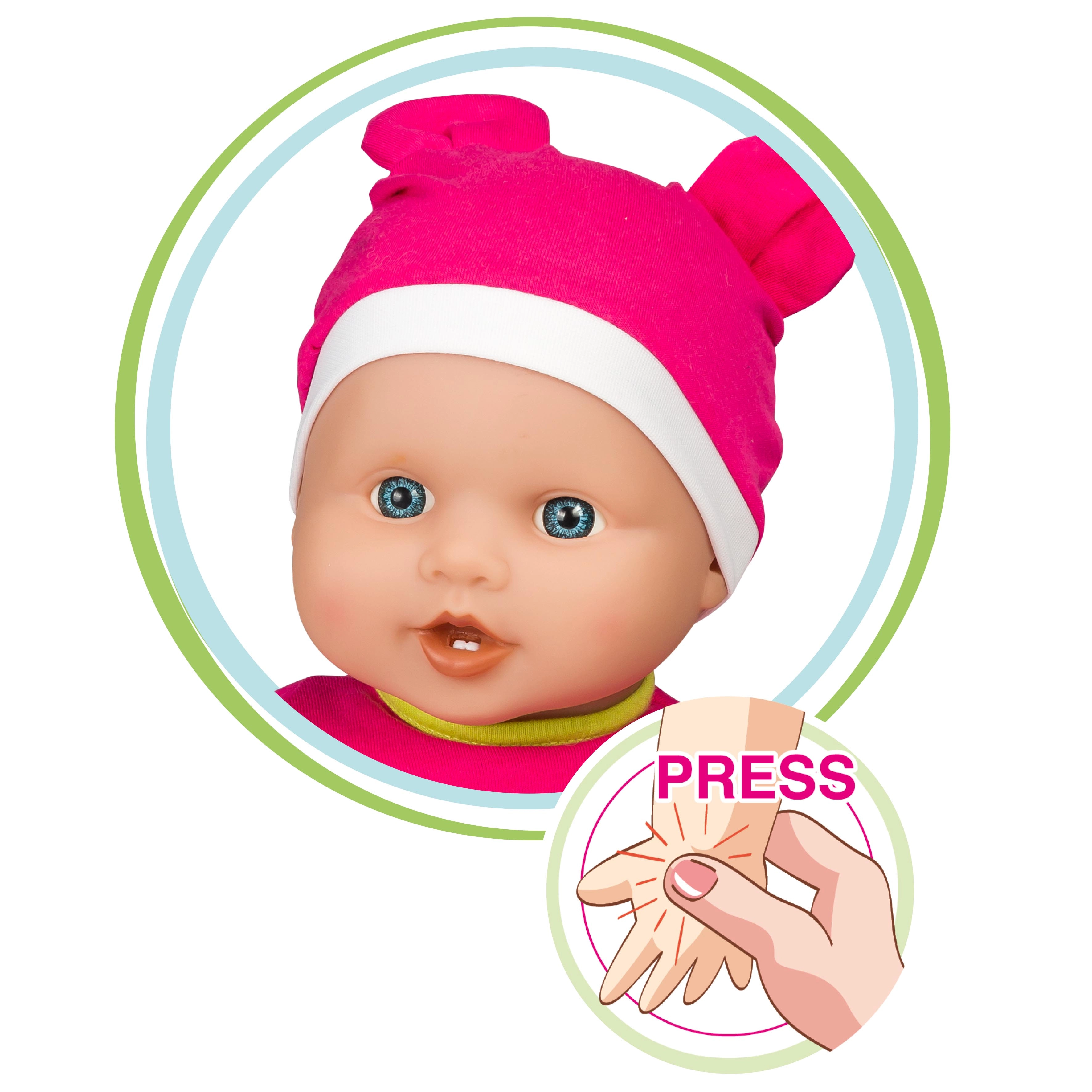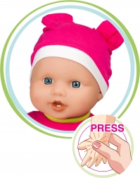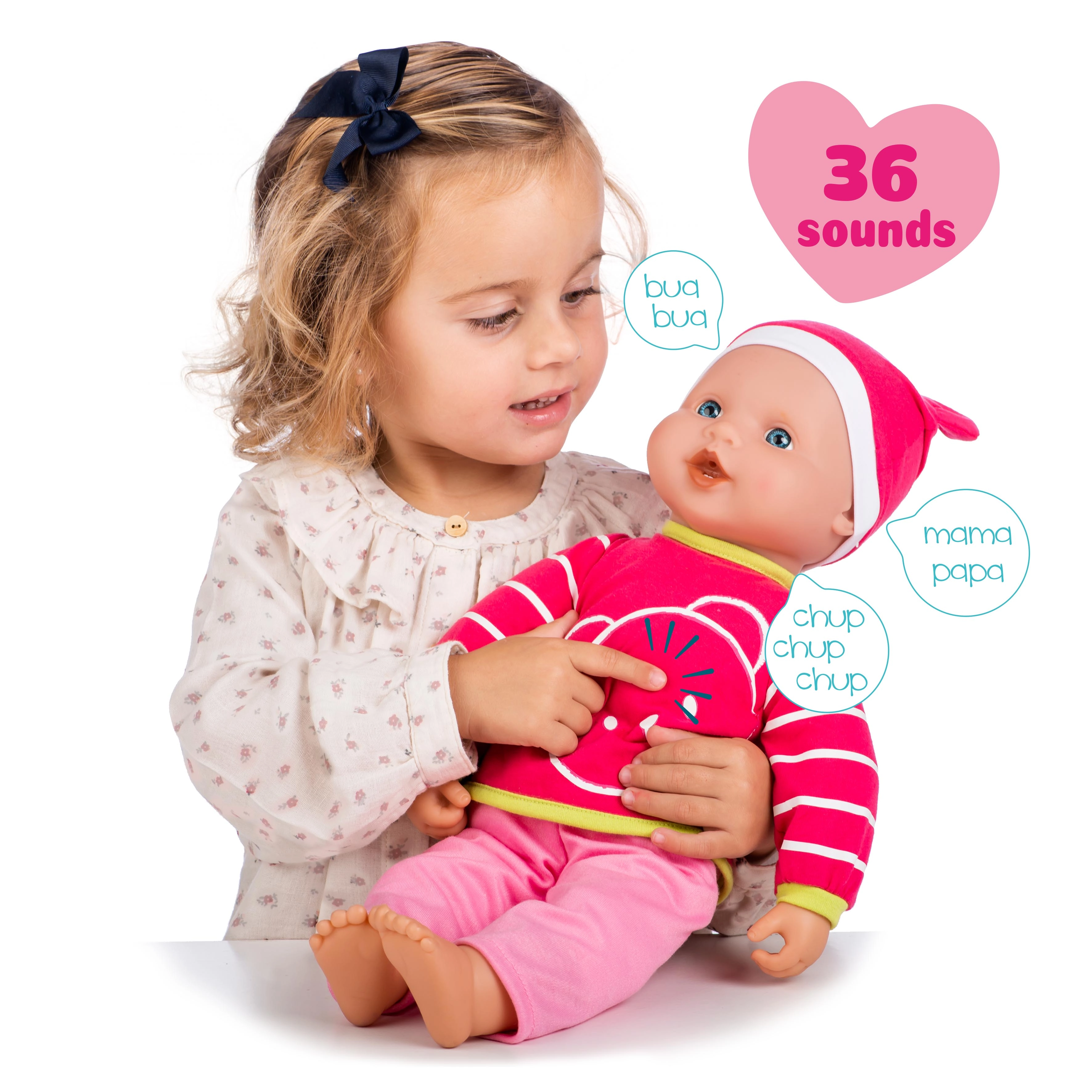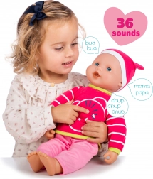 Ved tryk på knappen på brystet afspiller babydukken 36 forskellige lyde, som stimulerer børns fantasi og udvikler sociale færdigheder i rolleleg. Batterier 3× LR44 er inkluderet, så legen kan begynde med det samme.