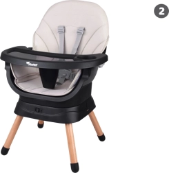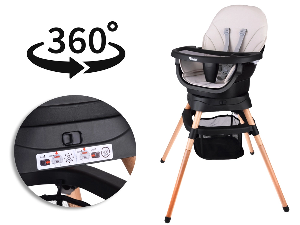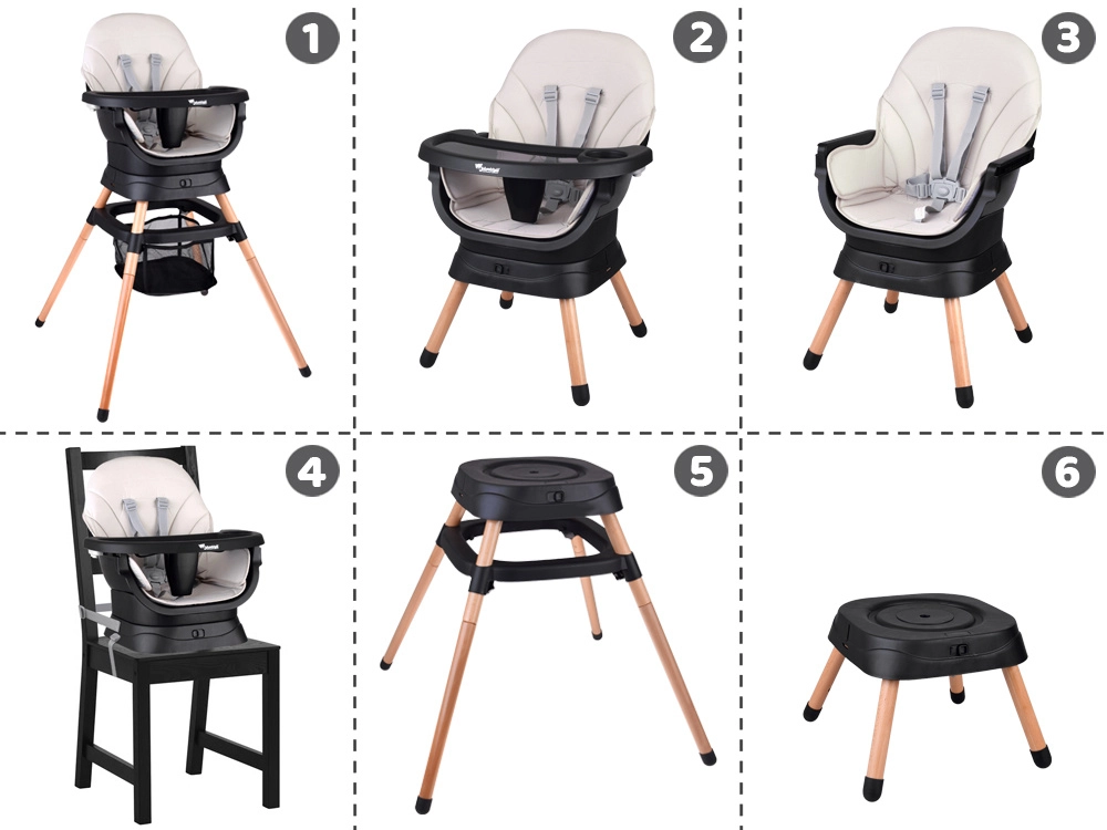 Den praktiske multifunktionelle højstol 6-i-1 vokser med dit barn og tilbyder sikker og komfortabel siddeplads til både spisning og leg. Takket være det 360° drejelige sæde med 8 positioner, fem-punkts sele og let aftørrbar konstruktion passer den perfekt i køkken, spisestue og børneværelse.