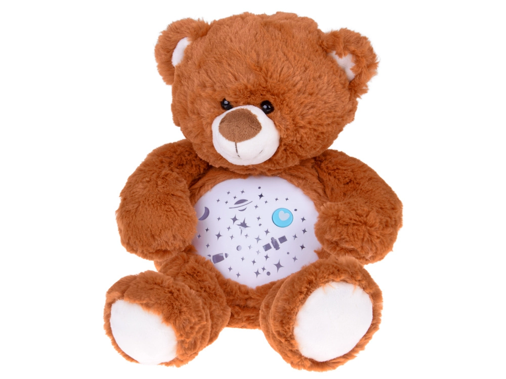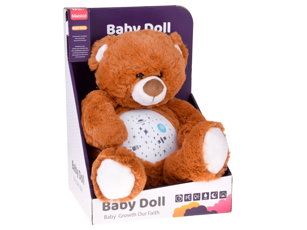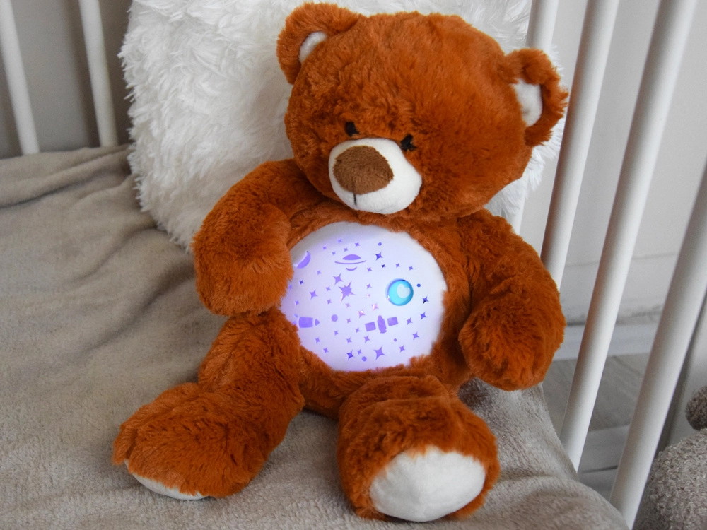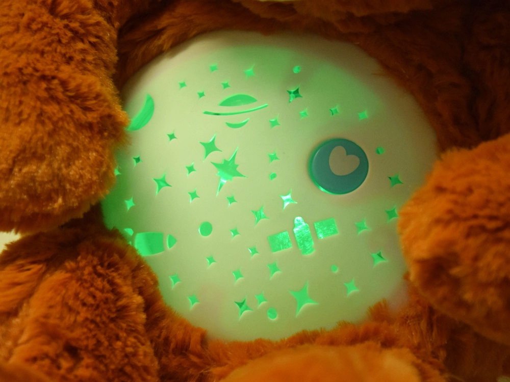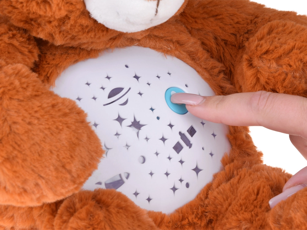 Den plyssete bamse med stjerneprojektor hjælper børn med at falde hurtigere og roligere i søvn. Fra bamsens mave projiceres stjerner, måne, planeter og raketter, ledsaget af beroligende melodier og et blidt skiftende lys. Takket være to-trins lydstyrkeregulering kan lyden let tilpasses babyens følsomme ører.