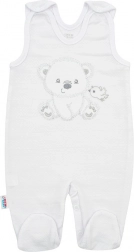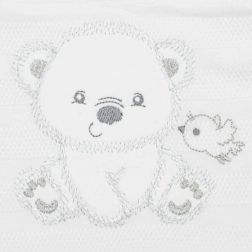 Sættet kendetegnes ved et smukt og unikt design med et attraktivt stofmønster. Bodyen prydes af broderet bjørn med fugl, sparkedragten har matchende print, jakken er ensfarvet med kontrastkant, og huen er formet over ørerne med snørelukning for sikker og komfortabel pasform.
