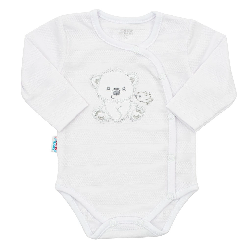 Dette elegante sæt til nyfødte indeholder en heldækkende body med lange ærmer, sparkedragt, jakke og hue. Alt er syet i blød og åndbar 100% bomuld, som er behagelig mod babyens sarte hud og egnet til daglig brug. Takket være praktisk trykknaplukning på skuldrene, mellem benene og langs hele jakkens længde er påklædning og bleskift nemt og hurtigt.