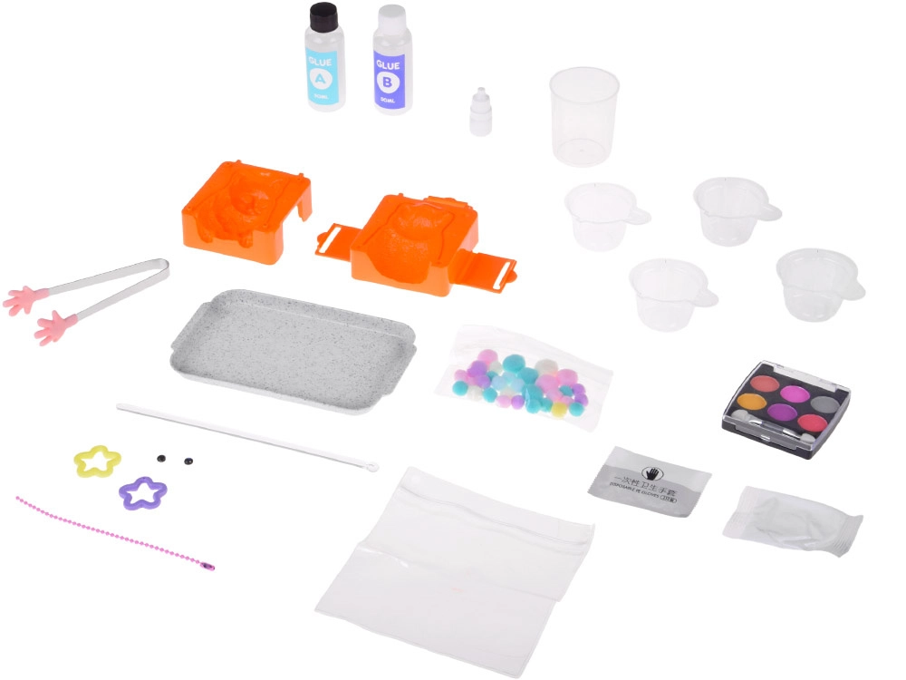 - Kompletsæt – form, lim A/B, farvestof, værktøjer og dekorationer.