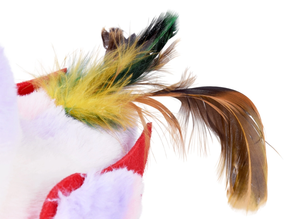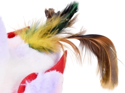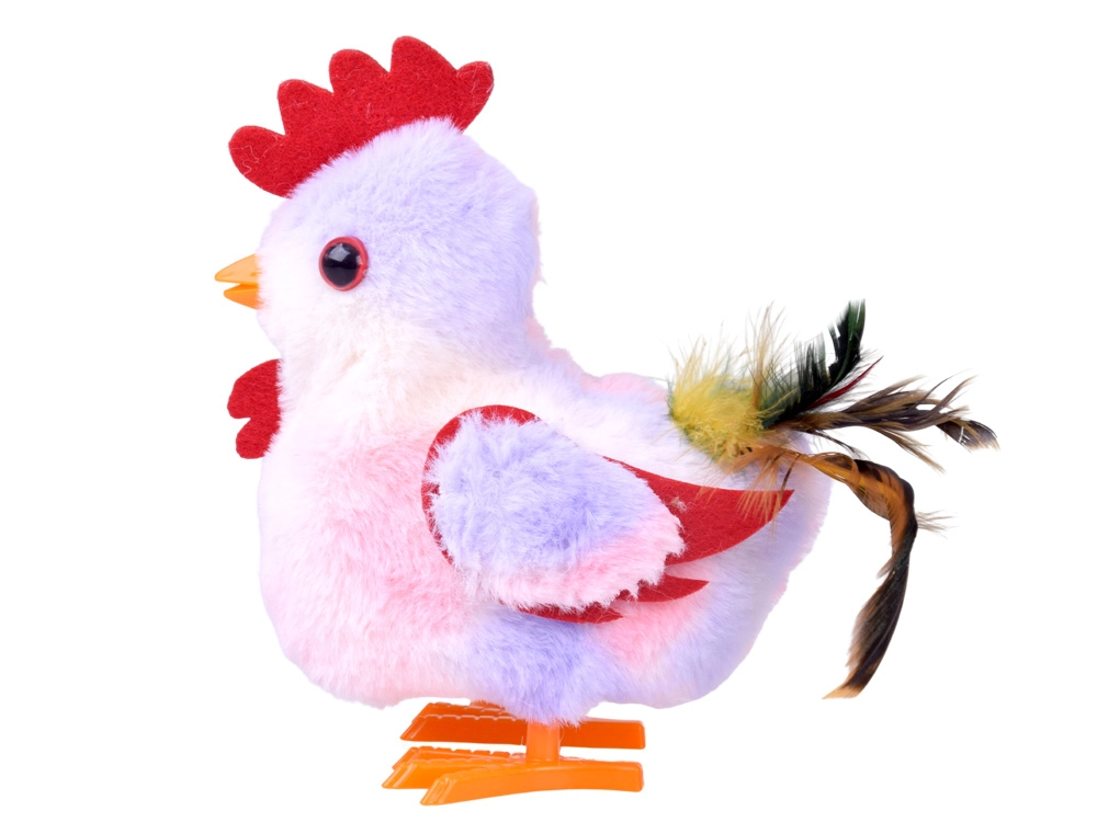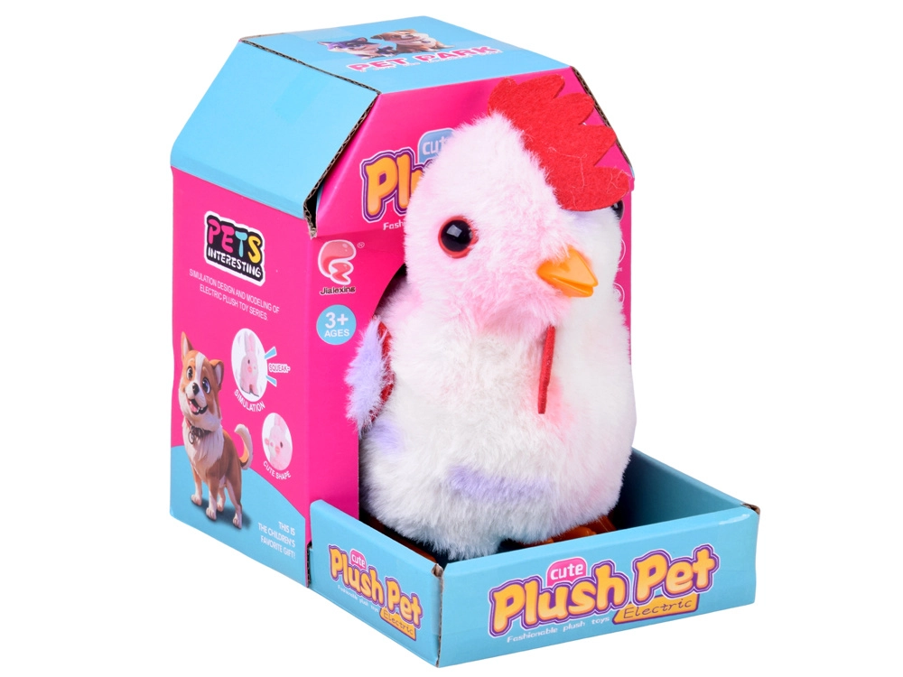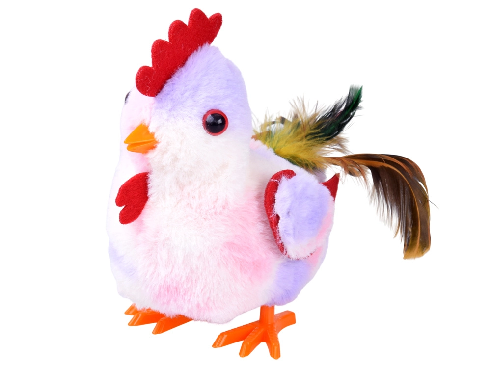 Sæt to AA-batterier i under maven og skub den røde kontakt til “ON”. Hønen begynder at: