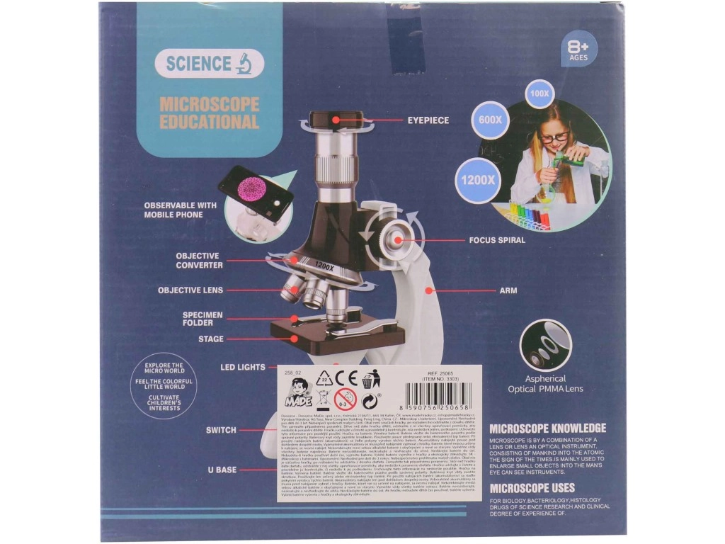 Dette børnemikroskop er et fremragende valg til de første skridt ind i videnskabens verden. Takket være den lette plastkonstruktion er det nemt at bære og egner sig både til hjemmet og skolen. Praktiske “vinduer” til observation gør det lettere at se prøver og hjælper børn med at forstå grundlæggende mikroskopi.