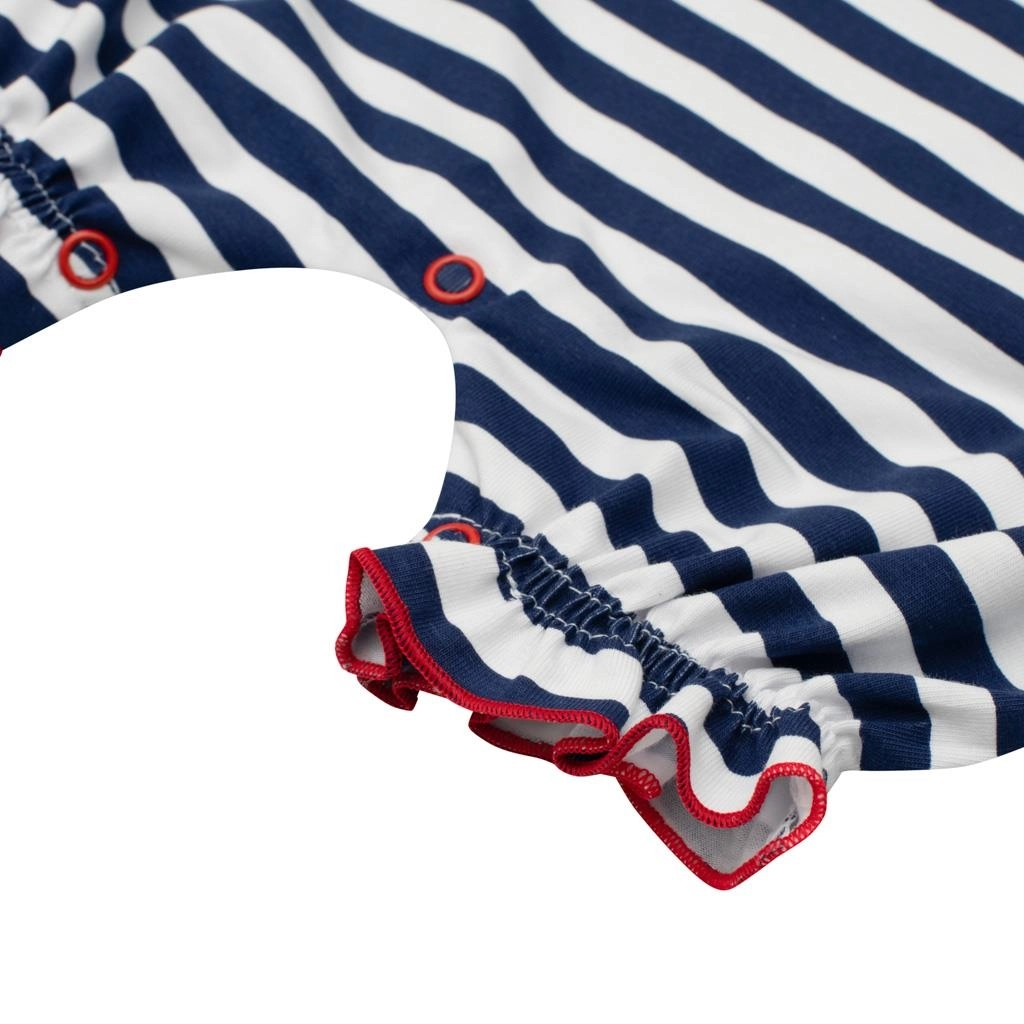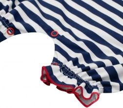 Sommerheldragten til piger New Baby Marine er et ideelt valg til varme dage. Let og åndbar 100% bomuld sikrer maksimal komfort, mens de moderne maritime striber giver et sødt look. Ankermotivet er foret på indersiden, så det ikke irriterer den sarte børnehud.