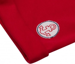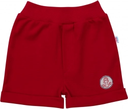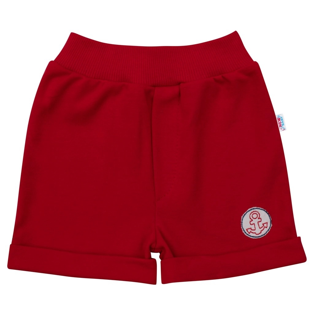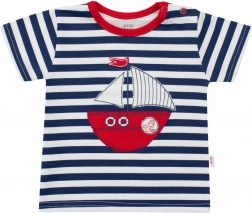 Stribet T-shirt med bådapplikation og røde shorts danner et stilfuldt sæt til små sømænd.