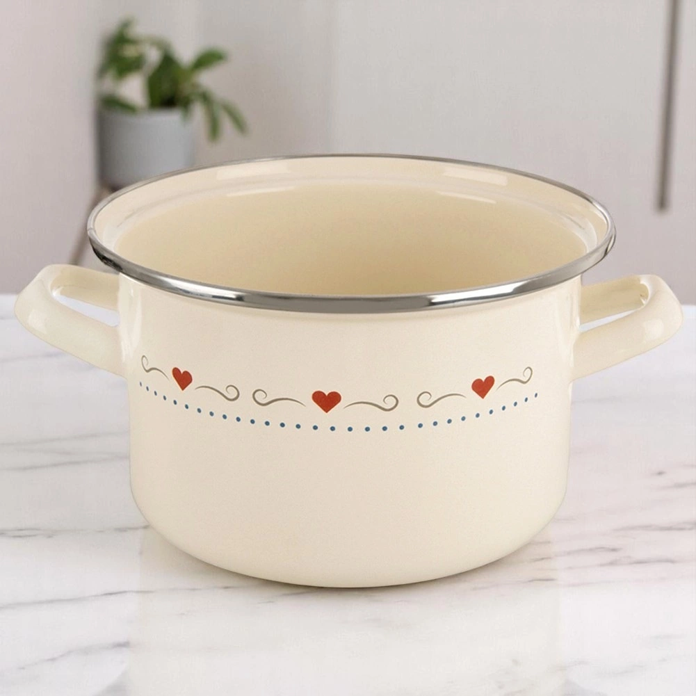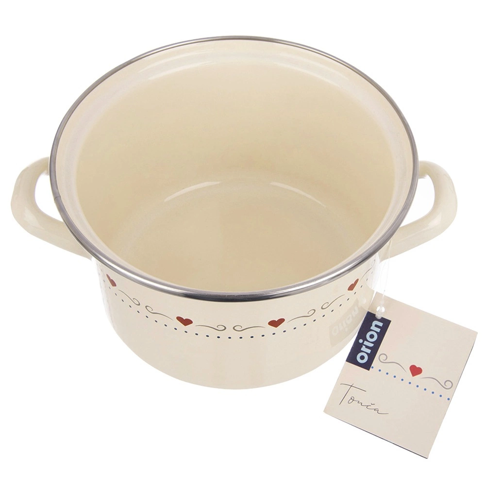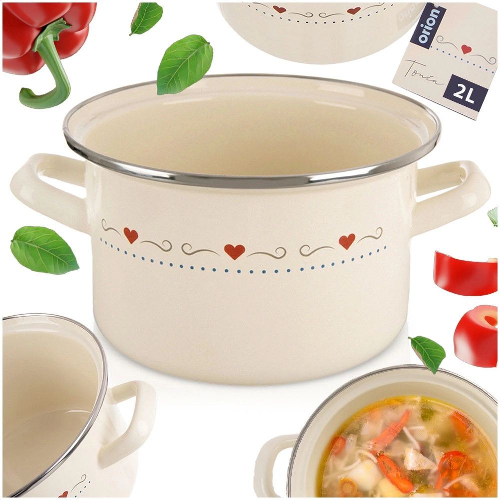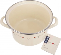 Opdag en praktisk hjælper til daglig madlavning. Den emaljerede gryde TONCA i retrostil er ideel til kogning og simreretter som supper, saucer og hovedretter. Det smukke cremefarvede design med små hjerter pynter i dit køkken, og de solide håndtag sikrer sikker håndtering.