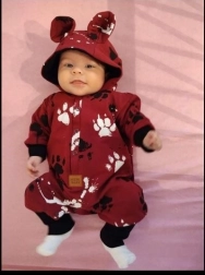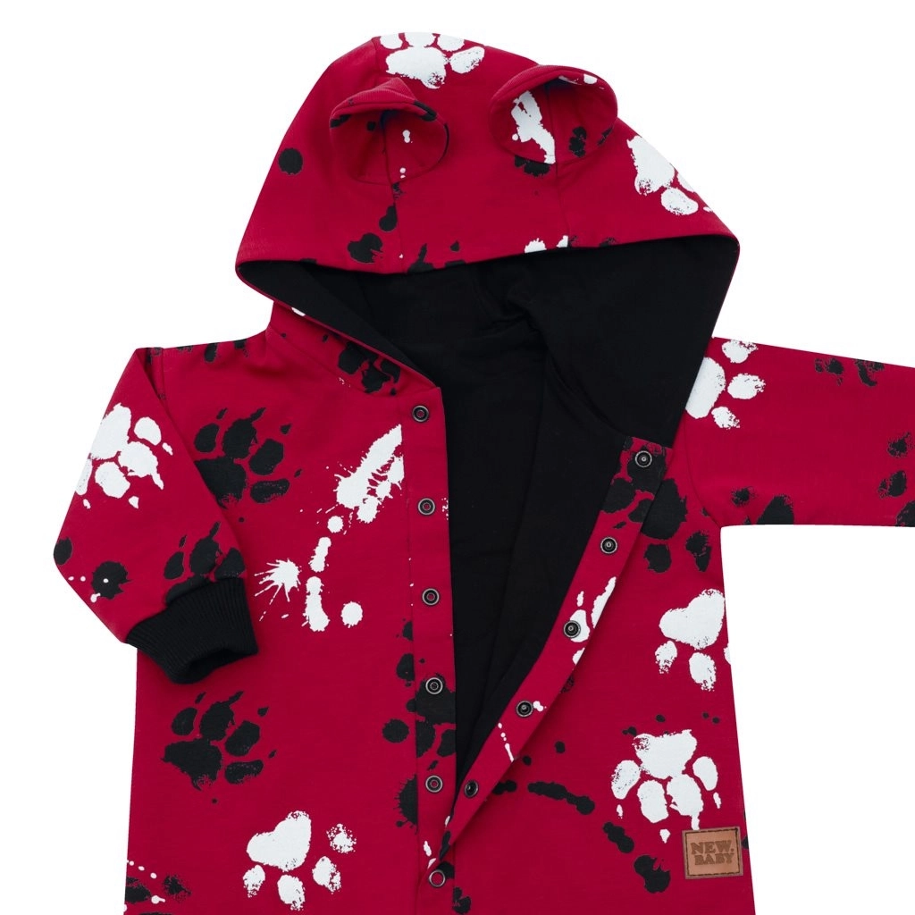 Sød og behagelig babyheldragt NEW BABY Paw til hverdagsbrug. Den er lavet af kvalitetsbomuld med et strejf af elastan, har blød bomuldsforing og tryklåse i hele længden for nem påklædning og bleskift. Hætte med ører, bredere elastiske kanter og varm inderside sikrer varme og komfort. Ideel til forår og efterår.