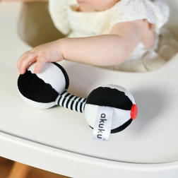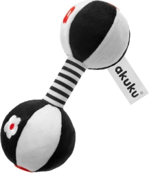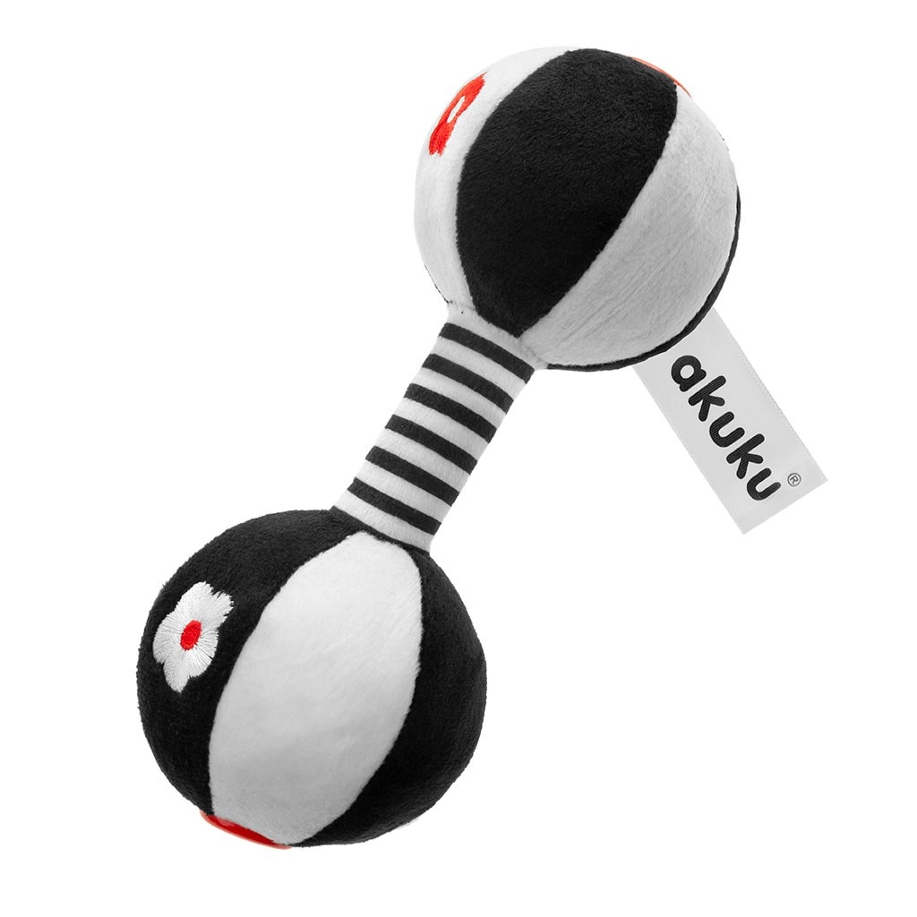 Blødt sensorisk legetøj formet som en håndvægt fra Akuku, der glæder babyer allerede fra fødslen. Takket være de kontrastfyldte farver stimulerer det synet, de indbyggede klokker understøtter hørelsen, og den bløde plys udvikler berøring og motorik.
