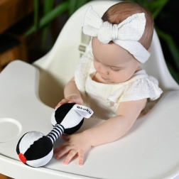 Dette kontrastlegetøj i form af en håndvægt er lavet af en behagelig plysstof, der er skånsom mod babys sarte hud. De sort-hvide kontrastelementer fanger barnets opmærksomhed og understøtter den visuelle perception fra de første dage. Indeni er der placeret blide klokker, som afgiver lyd ved bevægelse og hjælper med at udvikle de auditive sanser.