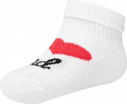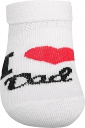 Forkæl din baby med blødhed og komfort. Disse hvide børnestrømper med den søde tekst “I ❤️ Mum & Dad” varmer, sidder godt og bliver på foden uden ubehageligt pres takket være den elastiske kant. Det kvalitetsrige materiale farver ikke af og bevarer formen over tid.