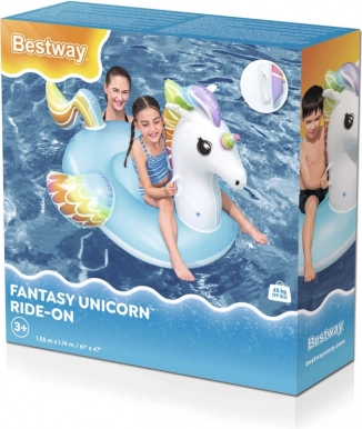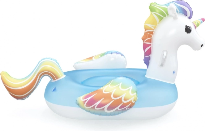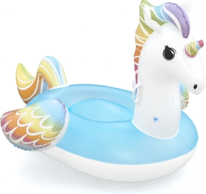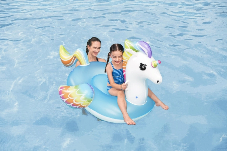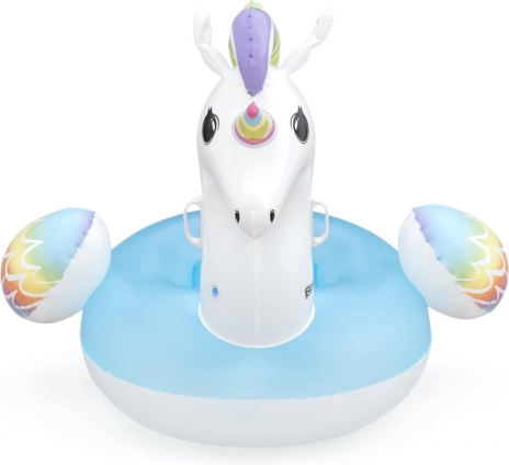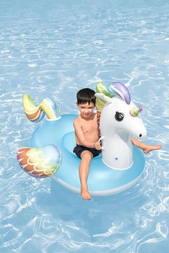 Den oppustelige enhjørning fra Bestway glæder med farverige regnbuefarver og et behageligt blåt sæde. Takket være den brede base og to solide håndtag føler børn sig trygge og komfortable under leg i vandet. Det kvalitetsrige PVC-materiale tåler daglig brug, så I kan nyde sommeren uden bekymringer.