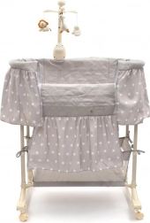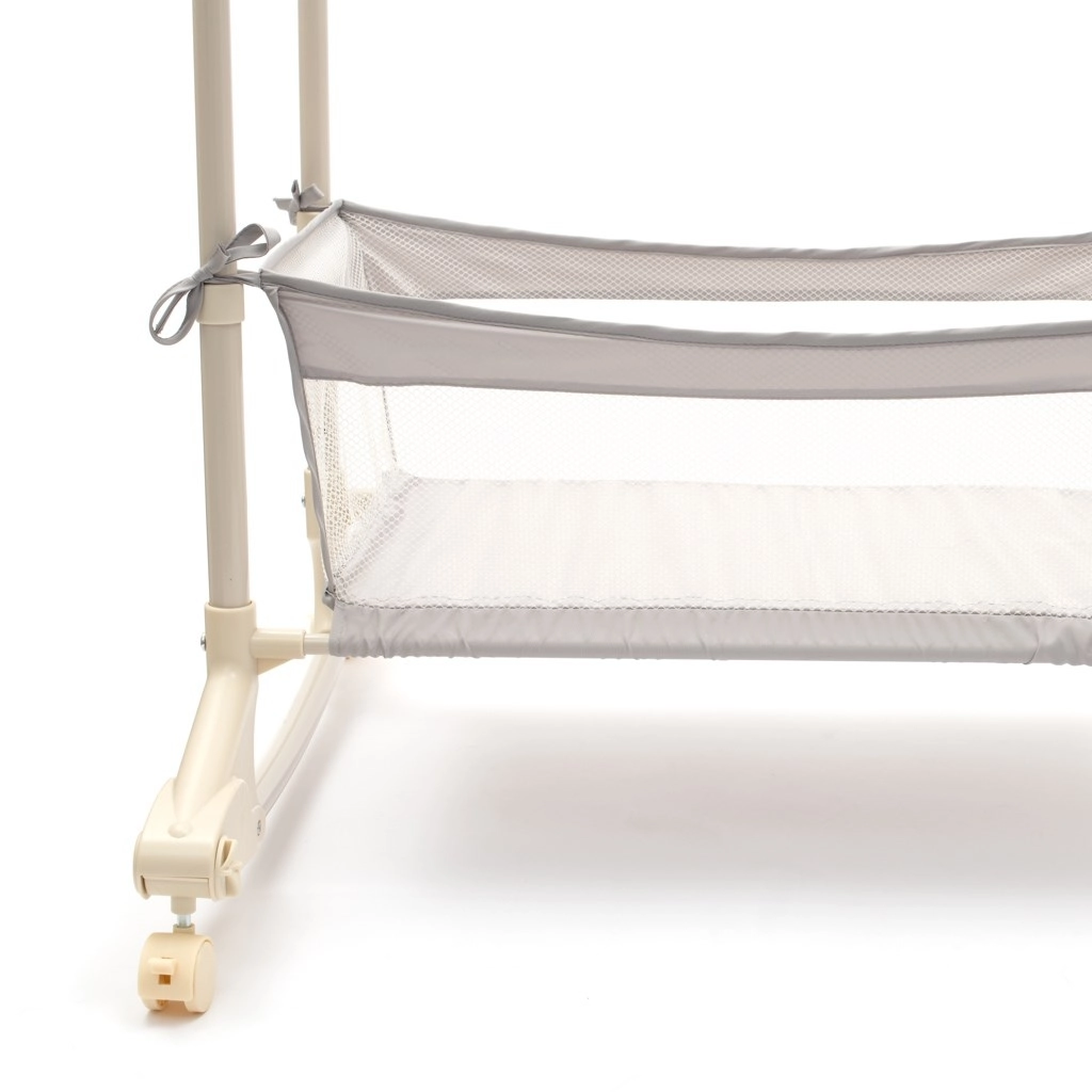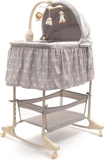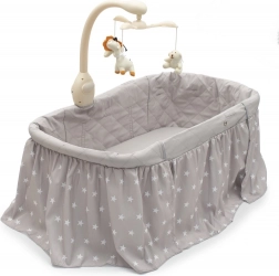 Der medfølger en uro med farverige dyr udstyret med natlys, lydmodul med 8 melodier og blide vibrationer – alt med trinløs regulering af intensitet og lydstyrke. Den praktiske nederste kurv holder alle nødvendigheder inden for rækkevidde, og den forstærkede indvendige polstring med vinylmadras sikrer hygiejne og nem vedligeholdelse.