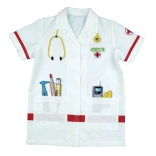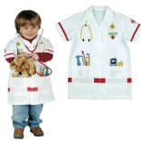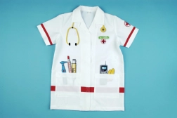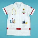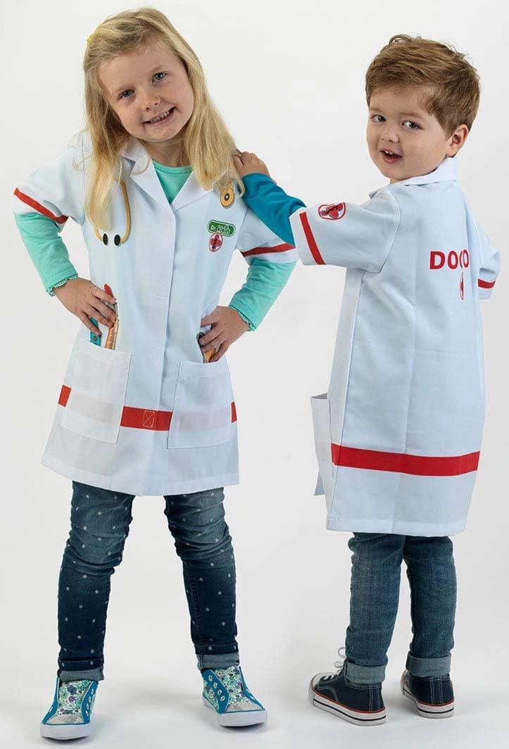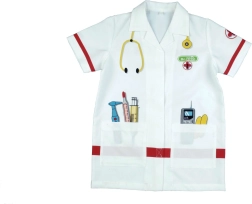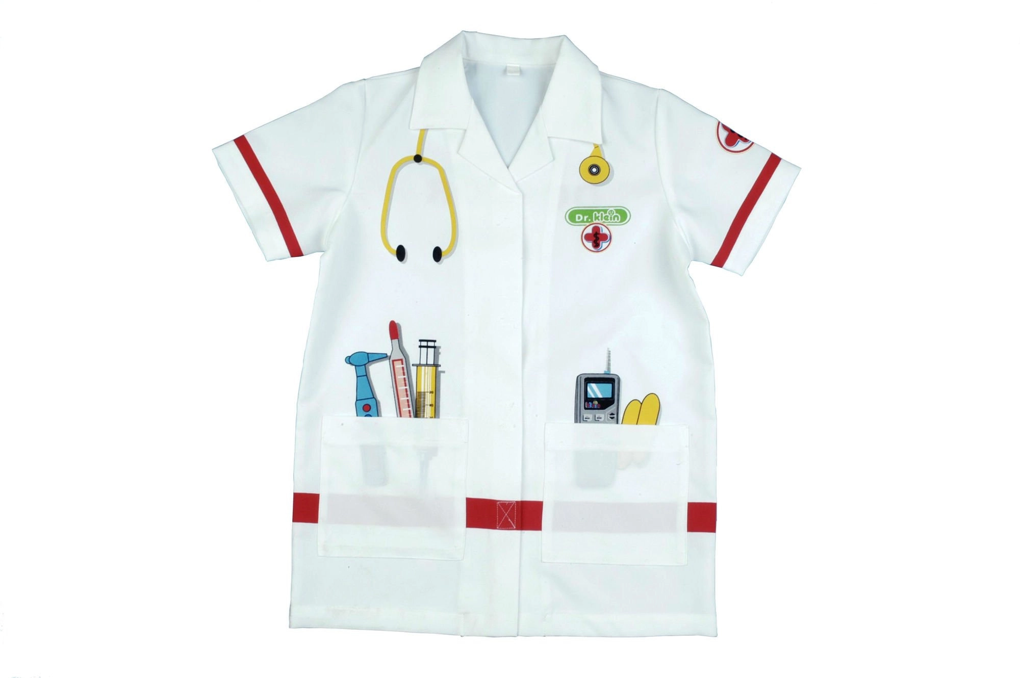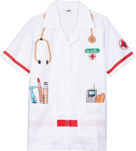 Børne-lægefrakken KLEIN vækker fantasien og udvikler sociale færdigheder gennem lægeleg. Let og behagelig pasform med krave, korte ærmer og velcrolukning gør det nemt at tage af og på. De farverige tryk af instrumenter giver legen autenticitet og sjov.