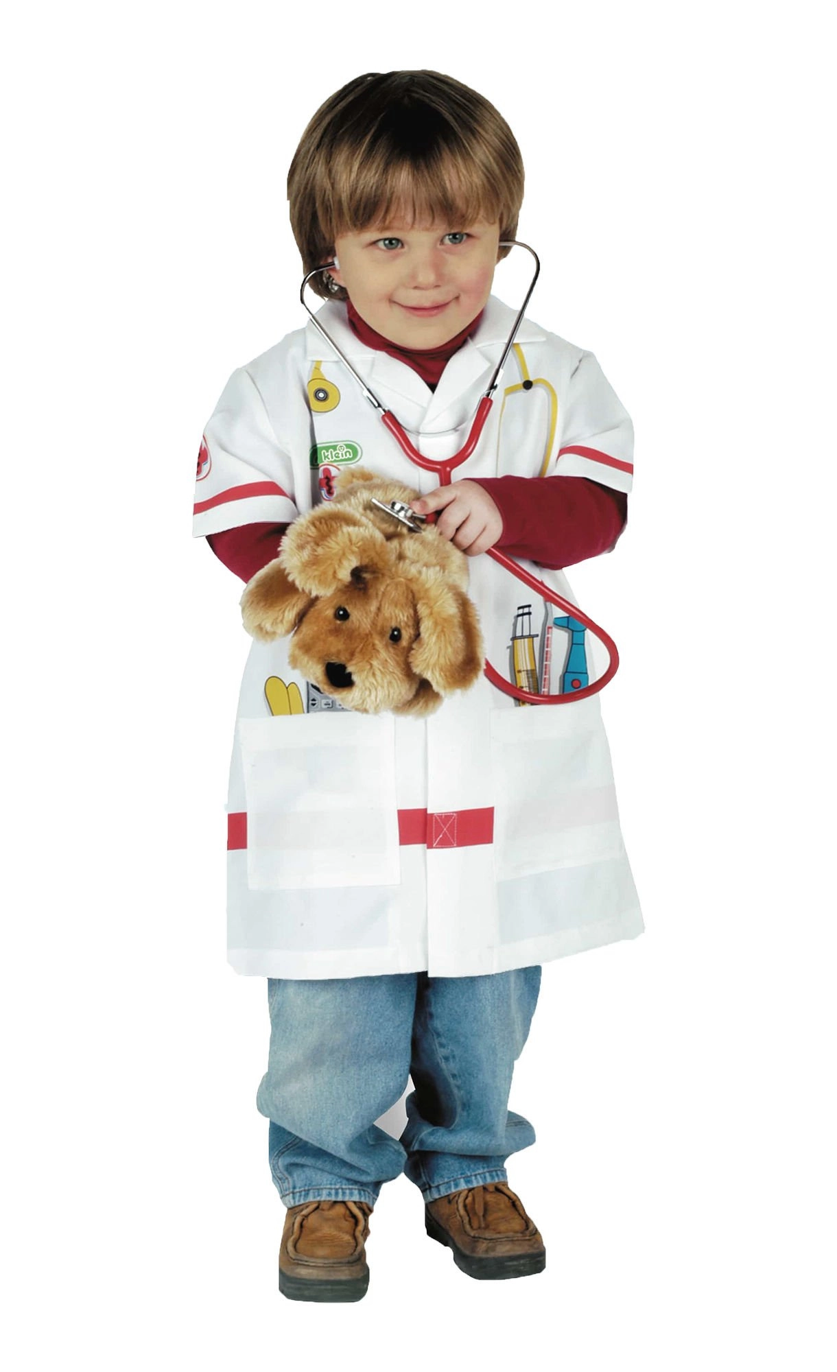 Stetoskop, termometer, sprøjte og andre motiver støtter realistisk lægeleg og stimulerer barnets fantasi.