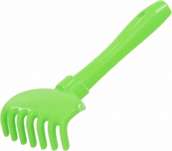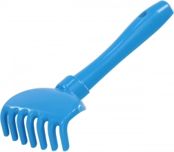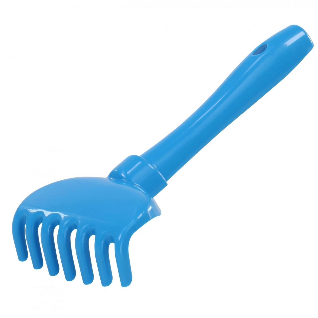 Det korte håndtag med ophængningshul og de brede tænder gør det nemt at rive sand og opbevare efter legen.